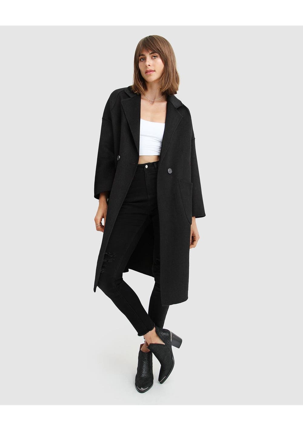Inspired by global fashion editors, the Publisher Double-Breasted Wool Blend Coat in an oversized fit is the modern take on the tailored notched collar coat. This smart casual piece coat emits boss girl vibes for your winter workwear style. Designed for an oversized fit. Take your usual size for the intended look or size down for a neater look. Length: 102cm (size small) Composition: 60% Wool, 40% Polyester Notched collar Patch pockets Double-breasted button closure Oversized fit Double brushed wool, no lining