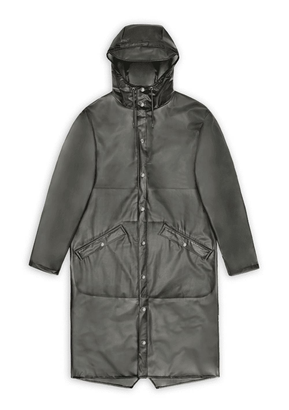 Longer Jacket is an ever-contemporary unisex rain jacket. Characterized by a minimal silhouette in a longer design. This rain jacket is a longer version of Rains' classic rain jacket. It features a placket with snap fastenings for closure, hood with built-in cap and two side pockets with snaps. Sleeves are finished with snaps making them adjustable for a loose or tight fit. The design is easy-to-wear with an elegant drape. The unisex rain jacket is completed with under-arm eyelets and a back yoke with concealed vents for breathable comfort. Longer Jacket is cut from Rains' signature PU fabric and features welded seams. The finish is lightweight with a smooth feel.