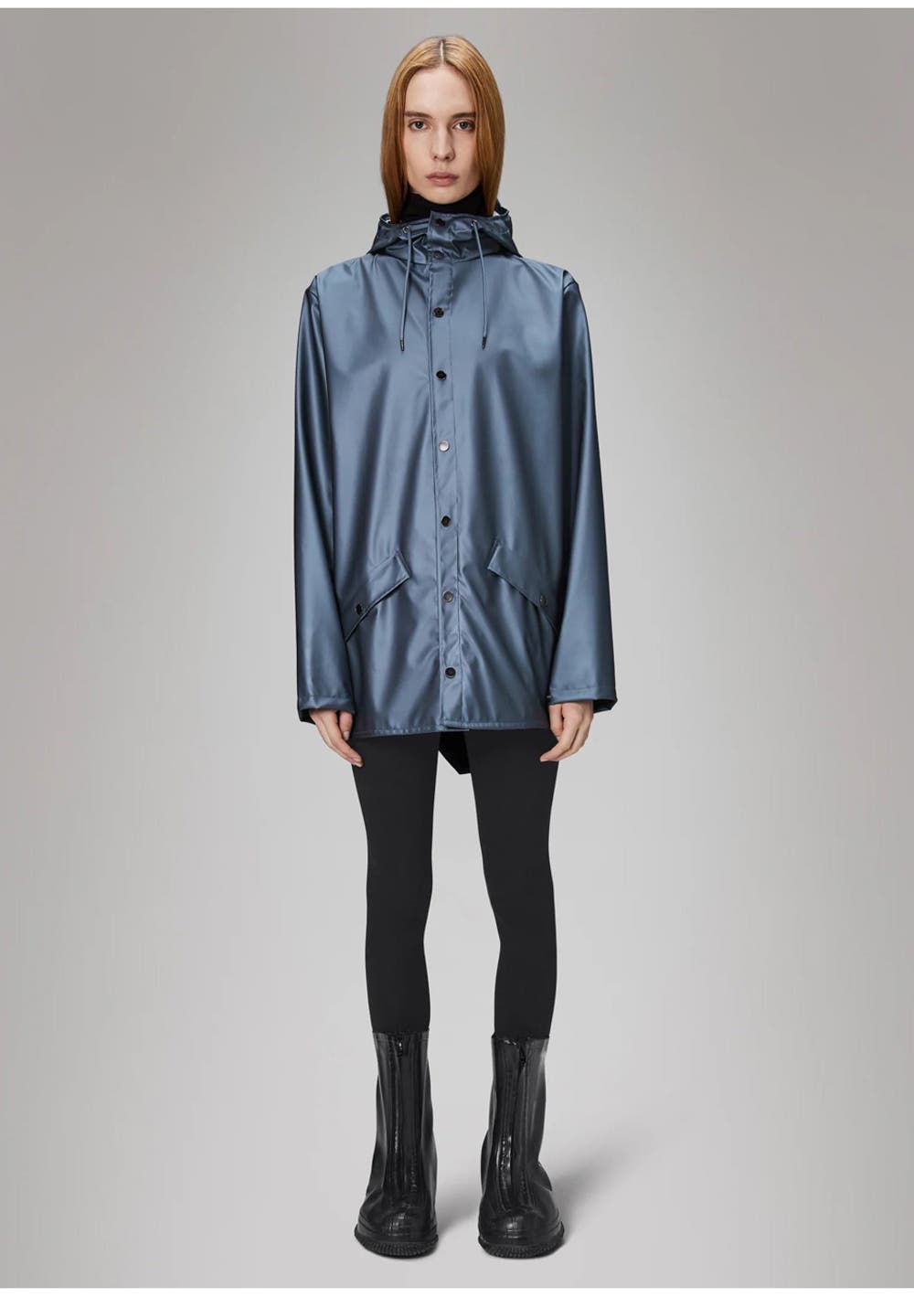 Jacket is an ever-contemporary unisex rain jacket. Characterized by a minimal silhouette with high functionality. This rain jacket features a placket with snap fastenings for closure, hood with built-in cap and two side pockets with snaps. Sleeves are finished with snaps making them adjustable for a loose or tight fit. The design is easy-to-wear with an elegant drape. The unisex rain jacket is completed with under-arm eyelets and a back yoke with concealed vents for breathable comfort. Jacket is cut from Rains' signature PU fabric and features welded seams. The finish is lightweight with a smooth feel.