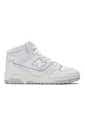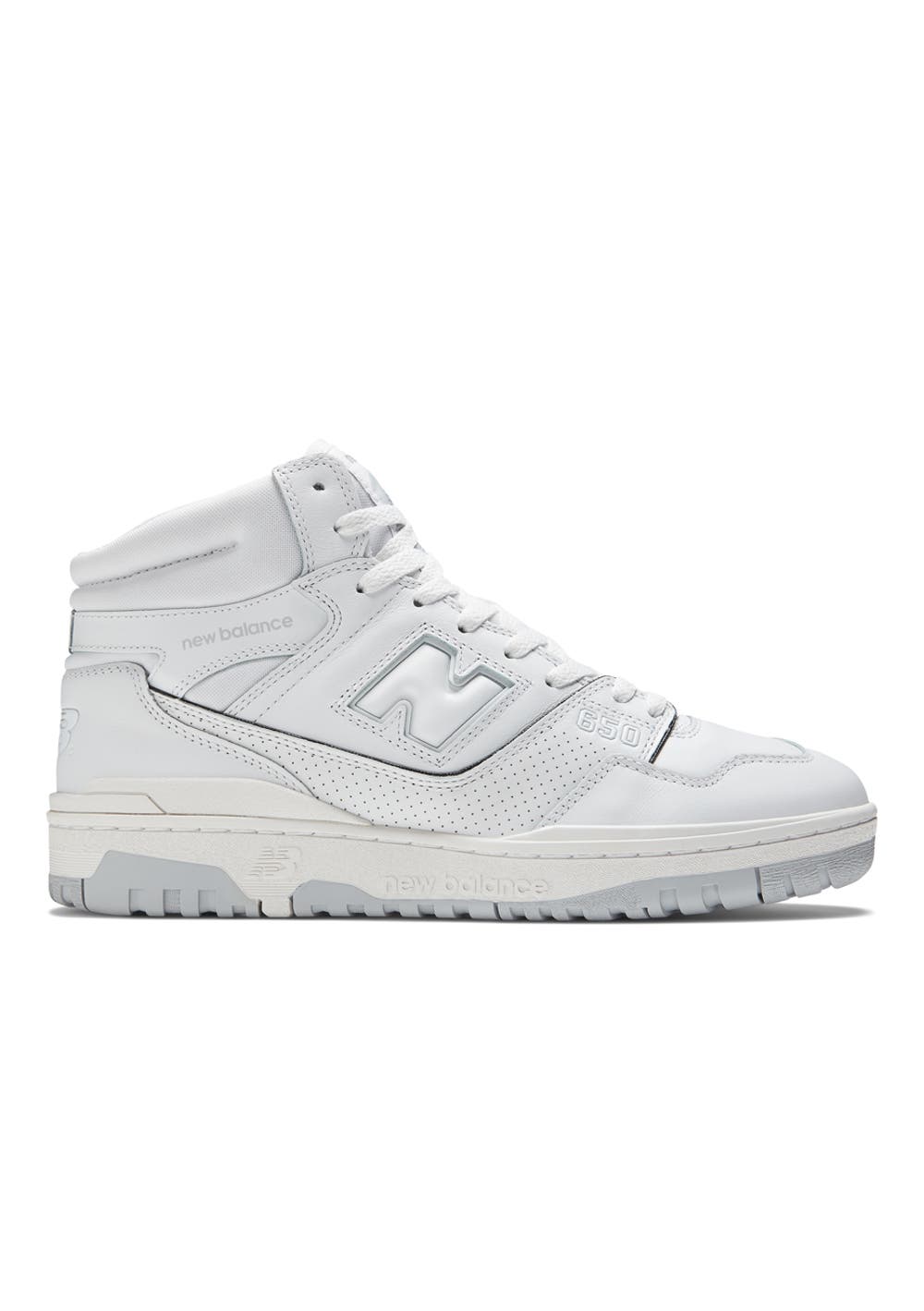 With the new 650 silhouette, New Balance introduces a hi-top counterpart to the wildly popular 550. While 1980s on-court design combined support features with epic proportions, the 650 offers a streamlined, ready to wear look. A classic, leather upper is bolstered with a puff and stitch collar, for a subtle reinterpretation of molded foam construction, while a raw edged leather eyerow applies the elevated construction, down to the last detail.