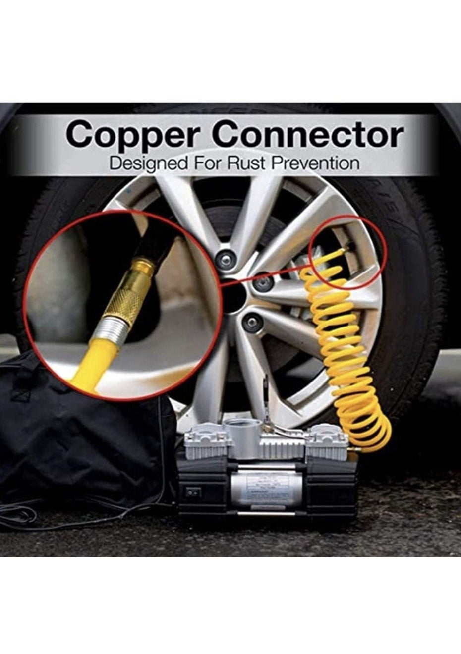 12V Portable Dual-Cylinder Car Air Compressor With Case Material:Aluminum alloy housing + ABS plastic Product Dimensions: Compressor: 24 × 9.5 × 15 cm Package Size:37.5x24.5x14.5 cm Weight:3.2 kg Key Features • Fast Inflation (60s) Inflate 195/60/R15 tires from 20–35 psi in just 1 minute (from 0–35 psi in 2.5 minutes), thanks to its powerful 70L/min airflow rate and dual 30mm cylinders. • Heavy-Duty Performance Equipped with a pure copper motor (50 copper coils + 146 shafts) for enhanced durability and stable operation. Suitable for SUVs, pickups, ORVs, sedans, ATVs, and MPVs. • Digital Pressure Gauge & Auto Shutoff LCD screen for real-time tire pressure monitoring. Auto-stop at preset PSI to prevent over-inflation. • LED Work Light Built-in bright LED flashlight ensures safe operation at night or in low-light conditions. • Copper Nozzle Connector Anti-rust, durable connector designed for long-lasting use, even in extreme outdoor conditions. • Multi-Power Options Comes with a standard 12V cigarette lighter plug and battery clamp for flexible usage. • Complete Emergency Kit Included: • 1 × Air Compressor • 1 × Yellow Coil Hose • 1 × Plier • 2 × Screwdrivers • 2 × T-Handle Tools • 1 × Cutter • 1 × Repair Glue • 5 × Repair Strips • 1 × Spare Fuse + Valve Caps • 1 × Instruction Manual • All in a sturdy PP Toolbox Package Includes • 1 × Double Cylinder Air Compressor • 1 × Carry Case with Full Repair Tool Kit • 1 × Instruction Manual ⸻ Compatible With Sedans | SUVs | MPVs | ORVs | Pickups | ATVs For heavy-loaded pickup trucks and unloaded cargo vehicles, please lift the tire before inflation.