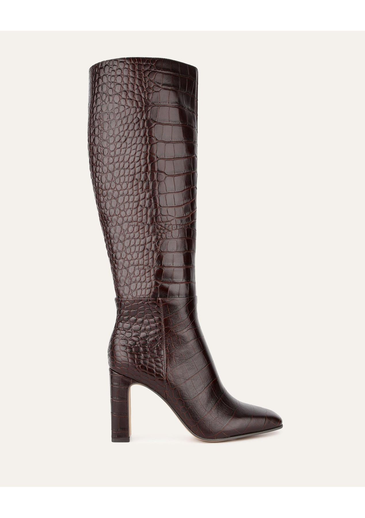 STORMI features a softly squared toe shape and a slim wrapped heel, creating a sleek and modern silhouette. Crafted from a croc embossed leather with a sueded resin sole, it’s finished with shiny silver zip puller hardware for a touch of shine. Specifications - High knee boot- Softly squared toe shape- Slim wrapped heel- Sueded resin sole- Soft gold zip puller hardware- Croc embossed leather - Full inside zip closure Heel height: 9.3cmUpper: LeatherLining: Leather & Non-leather Sole: Non-leather sole Shaft Measurements Size Boot Shaft Height (cm) Calf Circumference (cm) 36 38.3 38.4 37 39 39.4 38 39.7 40.4 39 40.4 41.4 40 41.1 42.4 41 42.5 44.4