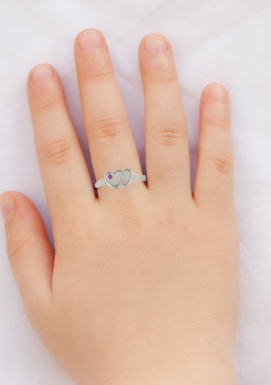 Sweet and timeless, this sterling silver double heart signet ring is a cherished piece in any child’s jewellery collection. The design features two overlapping hearts, with one delicately set with a created ruby for a touch of sparkle and colour. A meaningful keepsake and an iconic classic. Details: Genuine sterling silver with double heart design Set with 1 x 1.50mm AA-grade created ruby Available in size J Average weight: 1.69g Leaves our warehouse within 2 working days Please note: Model and lifestyle images are for style inspiration only. Actual product size may appear larger or smaller than shown