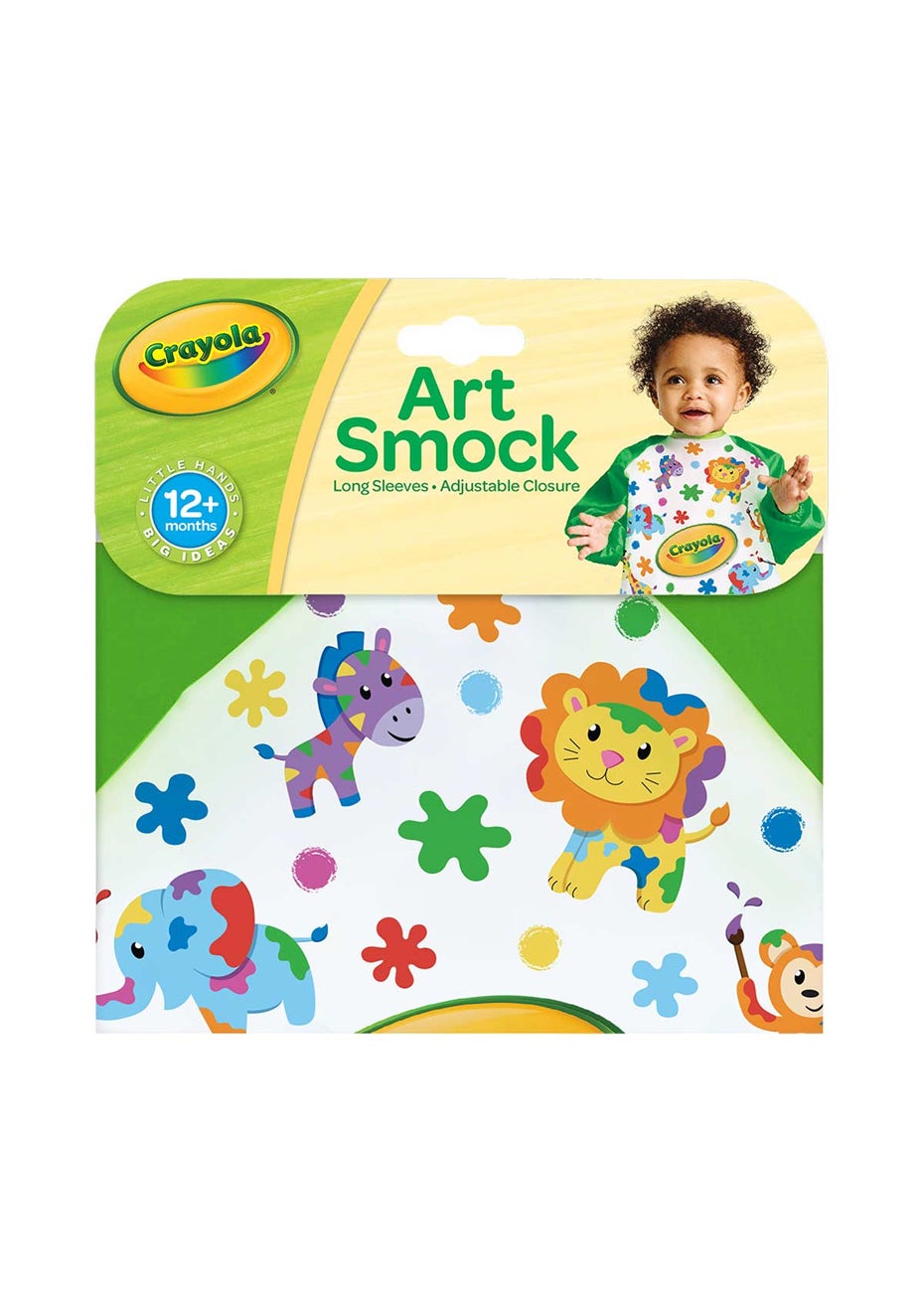 Give your young artist the freedom to draw, paint, and craft with the Crayola Art Smock for kids! It's an easy way to protect your child's clothes and skin from mess, so they can enjoy creating their own artwork with Markers, Watercolors, Paint, Glitter Glue, and more! A multicolor design adds a fun look to the smock and the long sleeves feature elastic cuffs to protect from drips and smears. Adjustable Velcro straps fit children ages 12 months and older. When theyre done creating, simply rinse the reusable apron and it's ready for next time! Pair with the Crayola Washable Finger Paint Kit (sold separately) for a great gift for toddlers. INCLUDES: 1 Reusable Art Smock