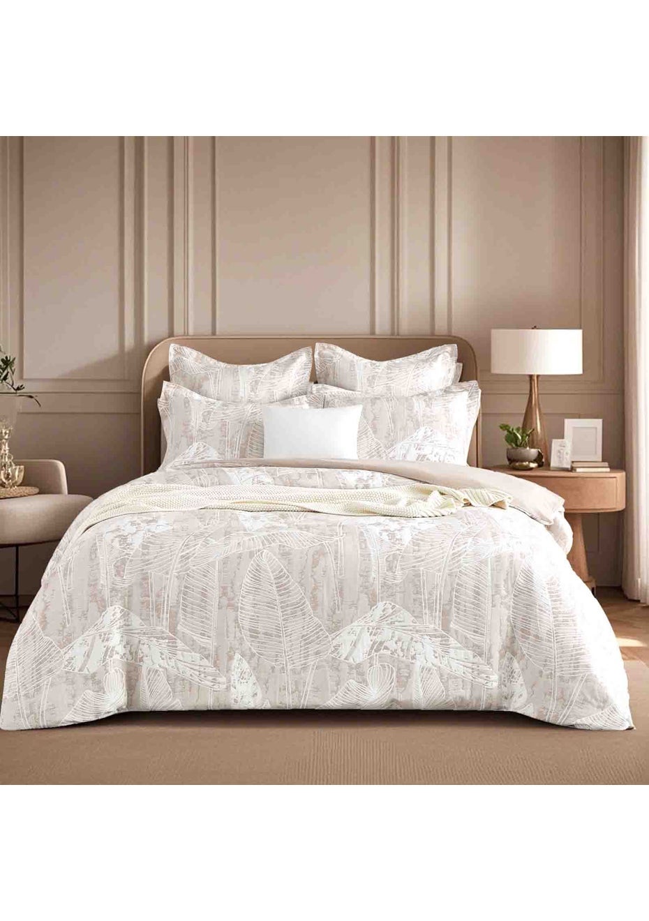 Renee Taylor Panache Jacquard Quilt Cover Set Wood Our Panache quilt cover set can transform your bedroom into a serene retreat with our elegant quilt cover set. Featuring a subtle botanical pattern in a soothing neutral palette of Beige & soft white, this design effortlessly complements any decor style. Crafted from premium cotton blend woven jacquard, it offers a luxurious texture & breathability for year-round comfort. Elevate your bedding experience with timeless sophistication & cozy softness. Perfect for adding texture & depth to your bedding while keeping the aesthetic clean & inviting. Features: • Luxuriously soft and naturally breathable for a restful sleep. • The woven design adds depth and style without the need for busy prints. • Complements any bedroom décor effortlessly. • It's also OEKO TEX certified which means no nasty chemicals. • Matching European Pillowcase available (sold separately). Size | Set Includes: • Double - 1 x quilt cover - 180 x 210 cms / 2 x pillowcase - 48 x 74 + 16 cms flap • Queen - 1 x quilt cover - 210 x 210 cms / 2 x pillowcase - 48 x 74 + 16 cms flap • King - 1 x quilt cover - 245 x 210 cms / 2 x pillowcase - 48 x 74 + 16 cms flap • Super King - 1 x quilt cover - 270 x 240 cms + 5 cms flange / 2 x pillowcases - 48 x 74 + 16 cms flange • European P/Case - 65 x 65 Cms + 5cm Flange. Sold separately. Product images are only visual representations, and while care is taken to ensure accuracy, colours may vary due to monitor variations. Wash Care Instructions: Front: Cotton Poly Reverse: 100% Cotton Wash separately before first use Cold gentle machine wash Do not use hot water Wash with similar colours Do not soak. Do not bleach Rinse well. Normal spin May be tumble dried cool or line dry in shade Warm iron if required Do not dry clean (X)