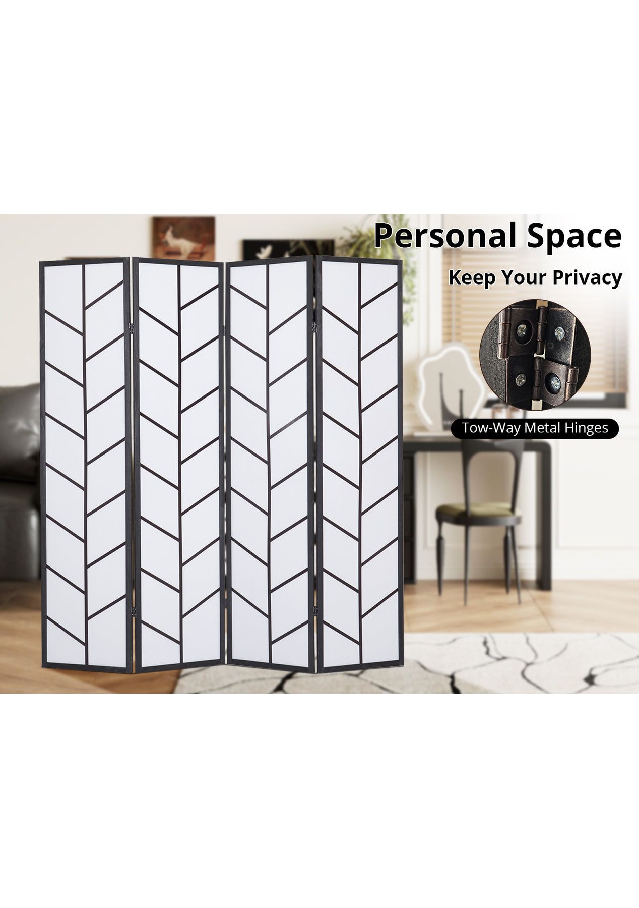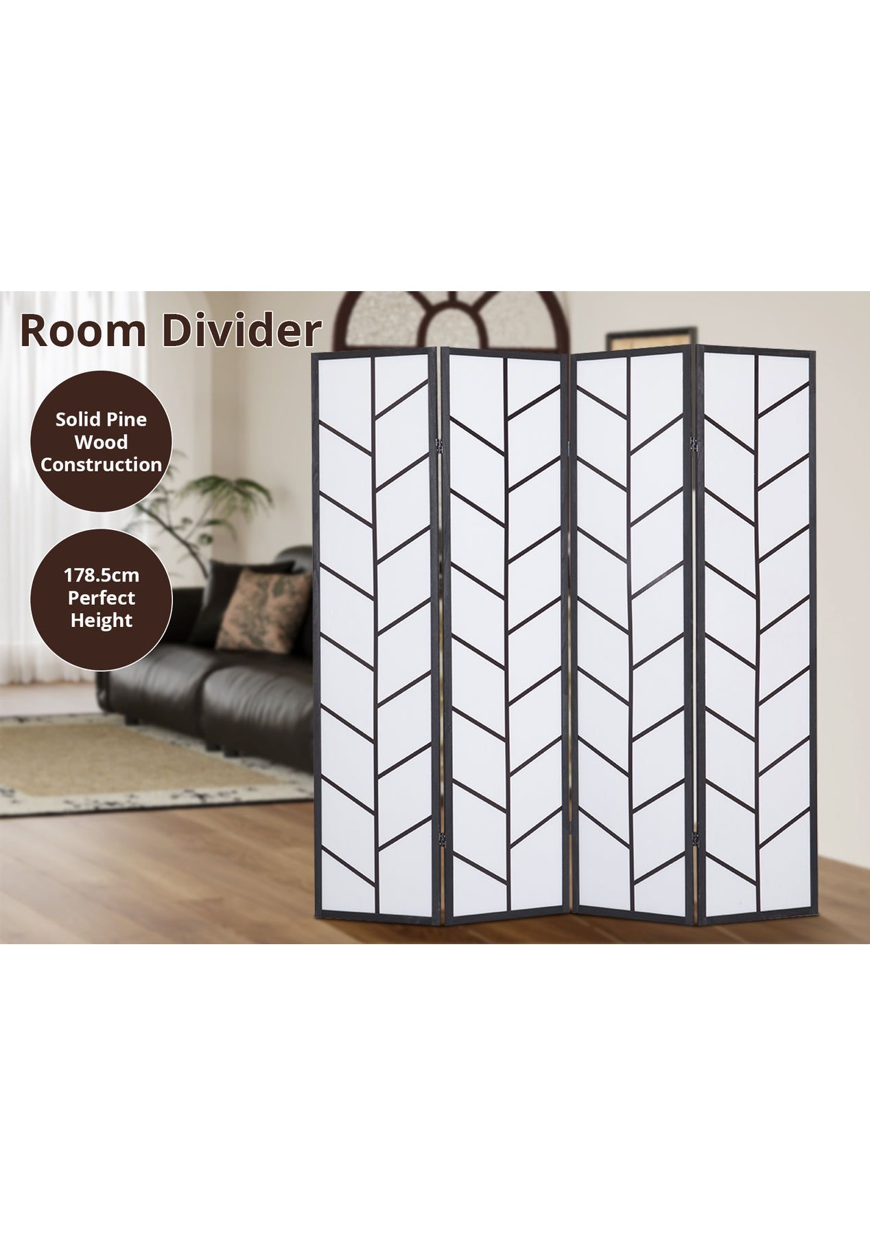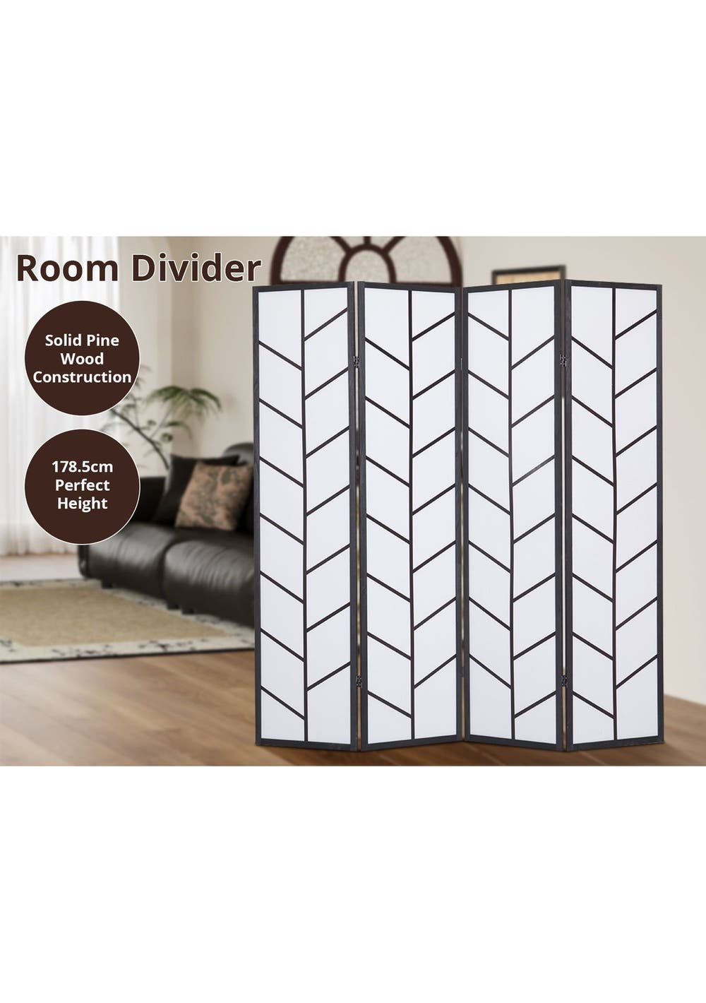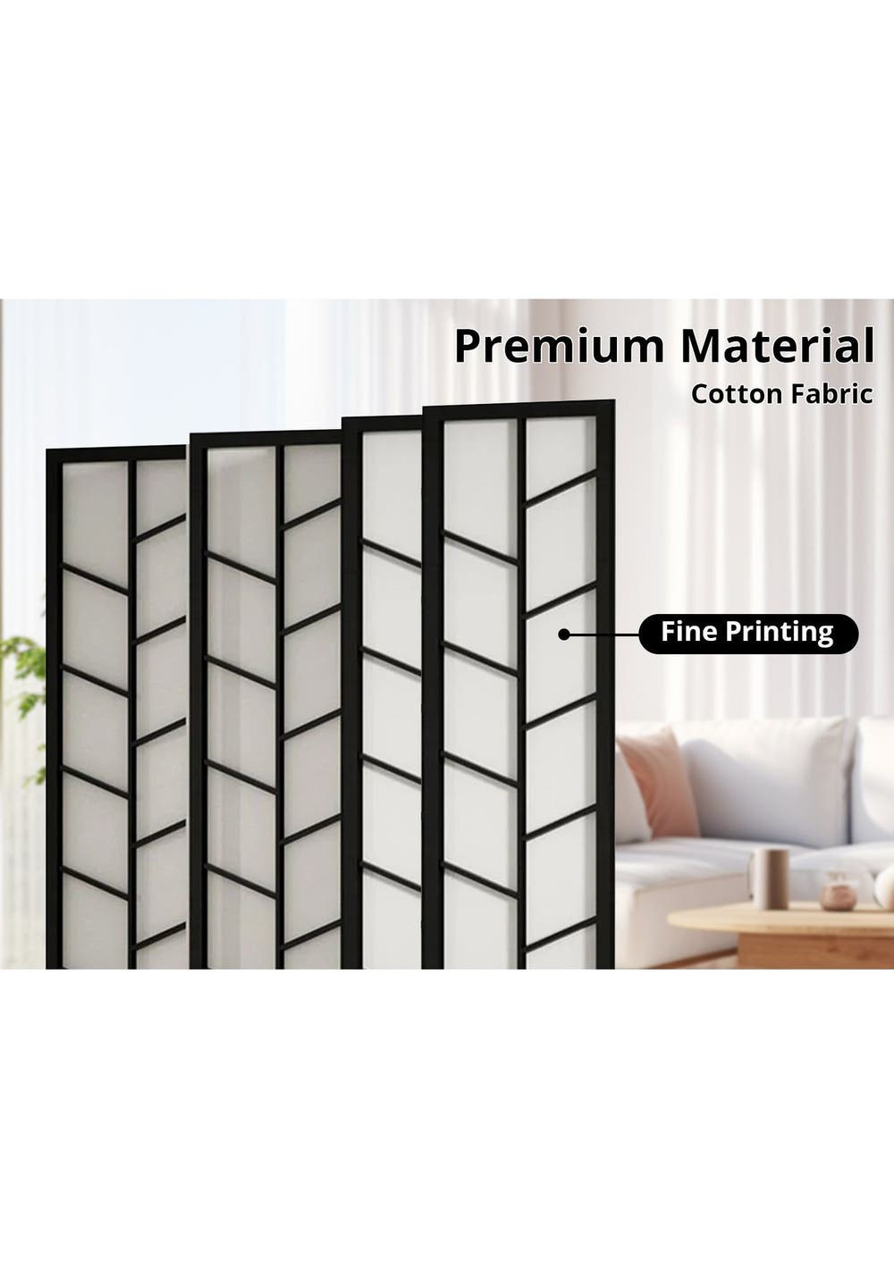 PR72141 Need some privacy? Or more practical use of space in your home? Consider using our room divider to create private pockets, simply dividing a large room into separate areas to create new focus points. Designed with a touch of oriental flair, our 4 panel room dividers look good from any angle. The pine wood construction is strong and sturdy to stand up to the task and easily maneuvered to anywhere that needs it. The screen itself is made of cotton fabric, when not in use, the room divider can be folded and stored away for its next use. So start creating some layered space with our durable room dividers and give your home a whole new dimension to it.Product Features: Brand NewPine wood construction frameFine printingNatural materialPractical screen and room dividerEco-friendlyFordable panelsFlexible and movableDurable and long lastingSpecifications:Material: Pine wood + cotton fabricColor: BlackDimension of each panel: W435xH1786xD18 mmPanel: 4Package Contents1pc/cartonPackaging Size: 510x1830x120 mm