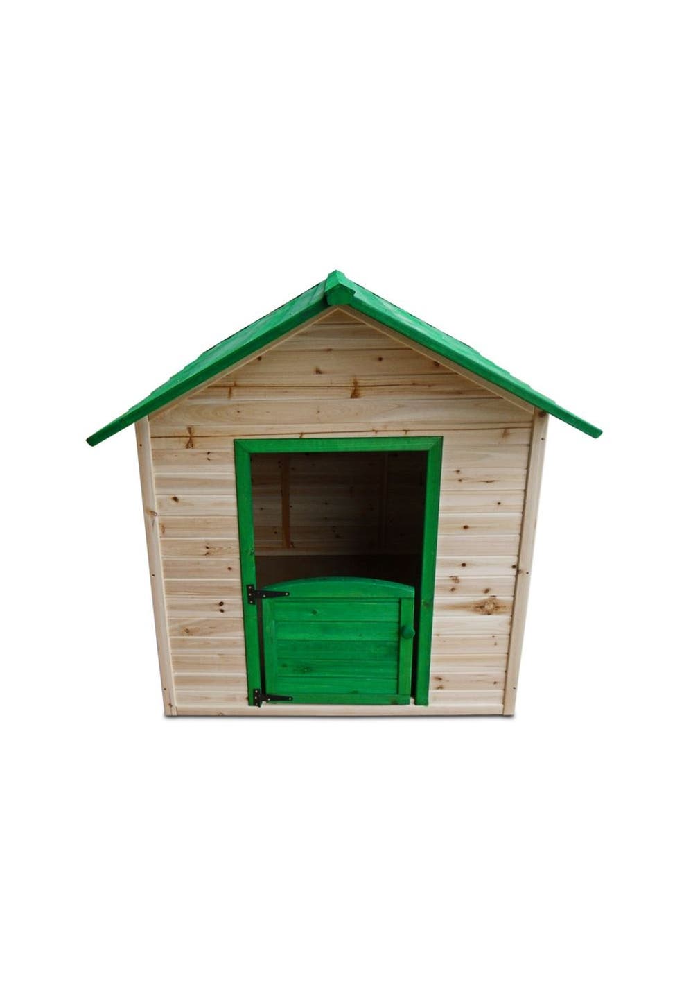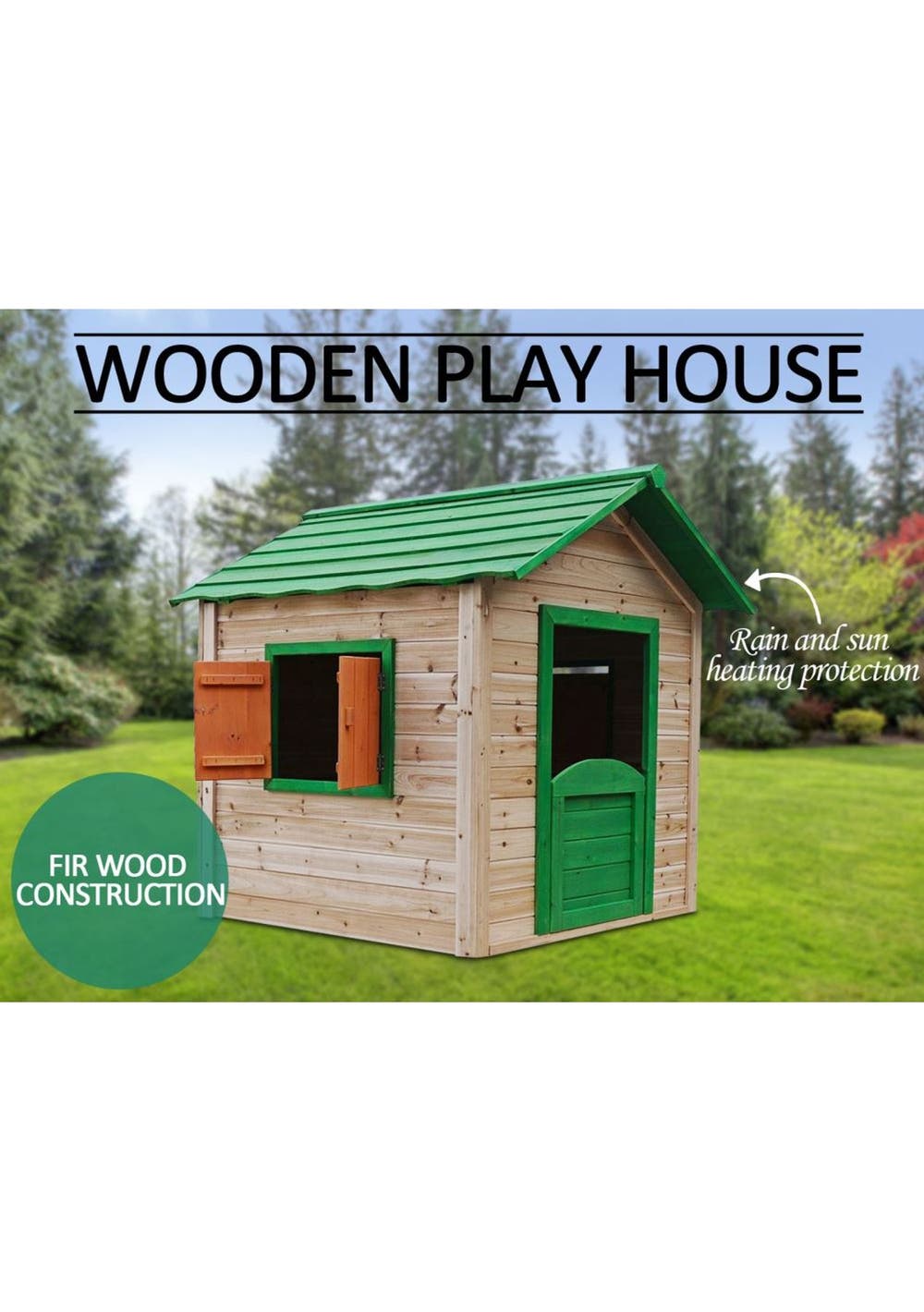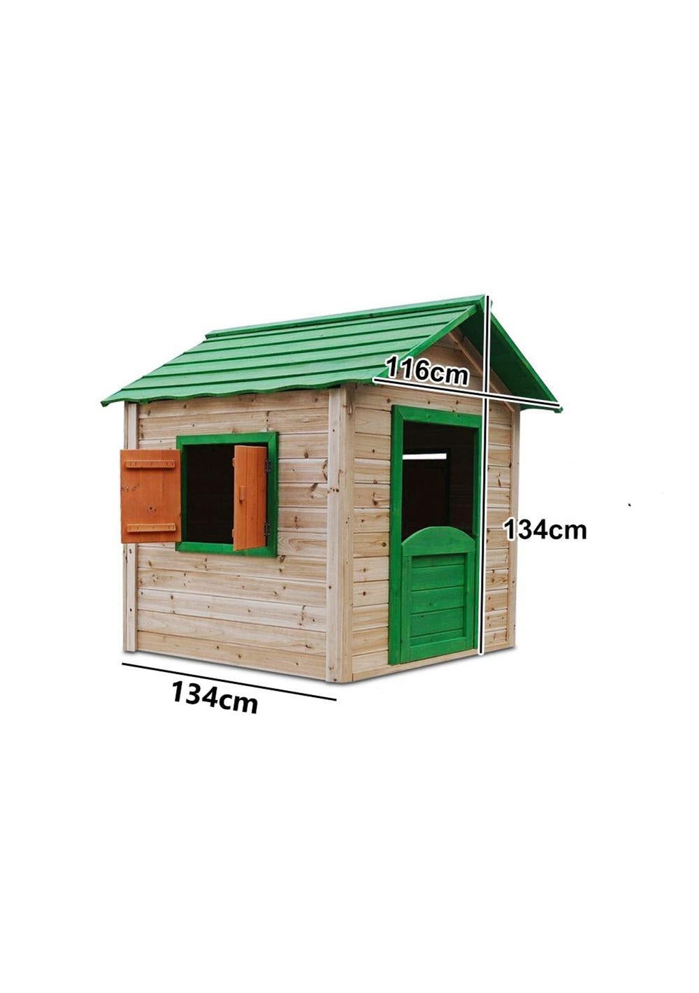 PR1431 *NOTE: SUITABLE FOR CHILDREN OVER 3 YEARS OF AGE. ADULT SUPERVISION IS REQUIRED AT ALL TIME.* Let your kid enjoy an active childhood in their own outdoor wooden playhouse. The little one will enjoy hours of fun in the perfect playhouse, inviting their friends or maybe spending the whole afternoon in it. Playhouse has viewing windows and a swinging front door to add a touch of real-life to the playhouse. Made from durable fir wood that is designed to last. It is built last with a weather-resistant roof, good for rain and sun heating protection. It allows your kids to explore a whole new world without leaving the backyard. Encourages kid's imaginative play with its realistic design and inspires them to 'play house' in their own personal space. It will be a perfect gift for the little one, they will love it for sure.FeaturesIncredibly lifelike designDurable sturdy fir wood constructionSwinging entry door at the frontViewing window to add the realismGreat for backyard and outdoor play areasTimber roof for rain and sun heating protectionNo glass material for added safetyNo floor in the houseAssembly requiredSpecificationsProduct Dimension: 1340x1160x1340 mmColour: Green, orange and natural wood in colour Package Dimension A : 134cm*107.5cm*9cmPackage Dimension B : 143cm*97.5cm*8cm