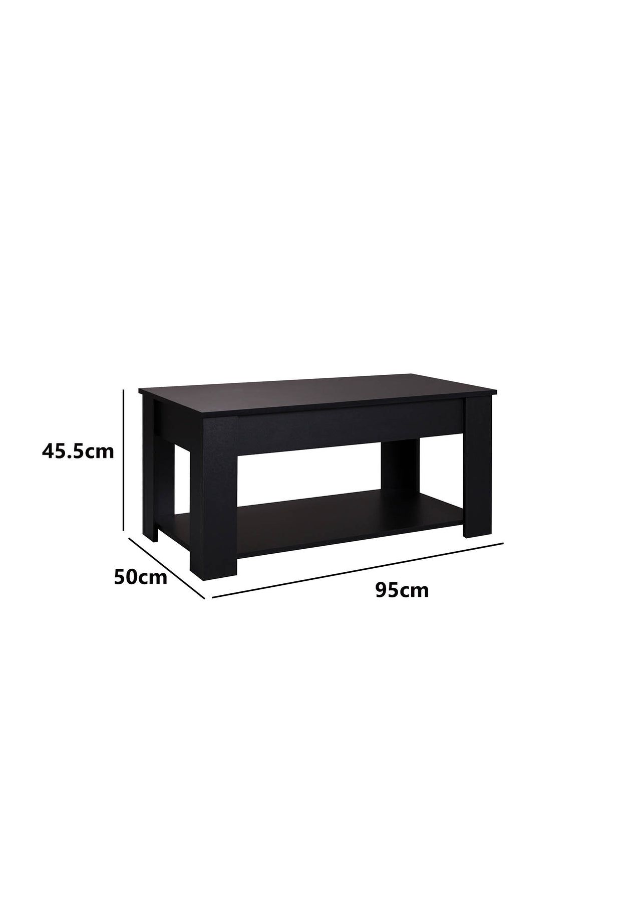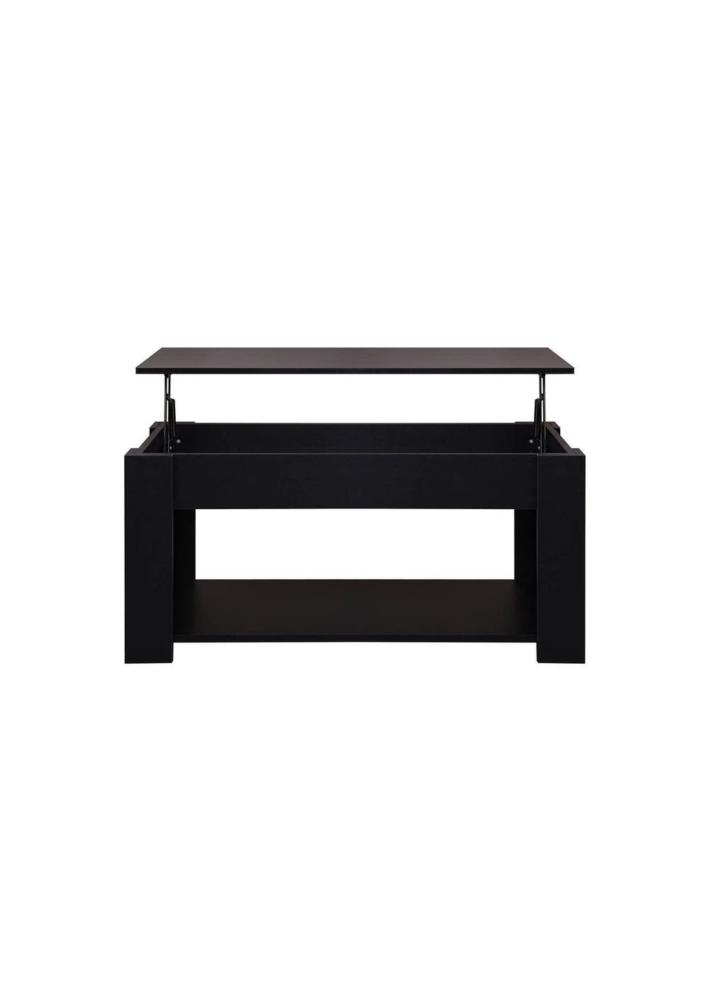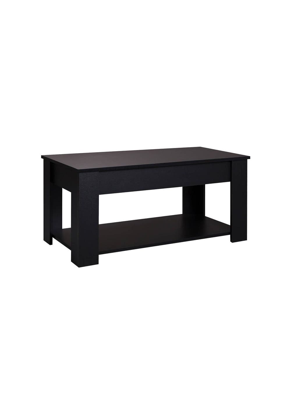 Lyftbar Coffee Table - Black Add function and style to your living space with the Lyftbar Lift-Top Coffee Table in sleek black. This modern coffee table features a hidden storage compartment beneath a lift-up top, ideal for storing remote controls, chargers, and other essentials. A lower shelf provides extra space for books and decorative items. Built from sturdy particleboard and metal fixings, it’s designed to last. With its clean lines and smooth lift-top, it’s ideal for any modern lounge or compact space. Features:Lift-up top design with hidden storage Sturdy black particle board construction Stable frame with solid legs Open bottom shelf for extra storage Space-saving and easy to organize Smooth lift with metal slider bar Steel fixings for long-lasting durability Specifications:Color: BlackMaterial: ParticleboardProduct Dimensions: 95 cm (L) x 50 cm (W) x 45.5 cm (H)Lift-up Tabletop Weight Capacity: 15 kgHidden Storage Weight Capacity: 10 kgShelf Weight Capacity: 5 kgAssembly: Required Package Contents:1 x Lyftbar Coffee Table Black (flat-packed in box)1 x Assembly Instruction ManualAll required screws and fittings included