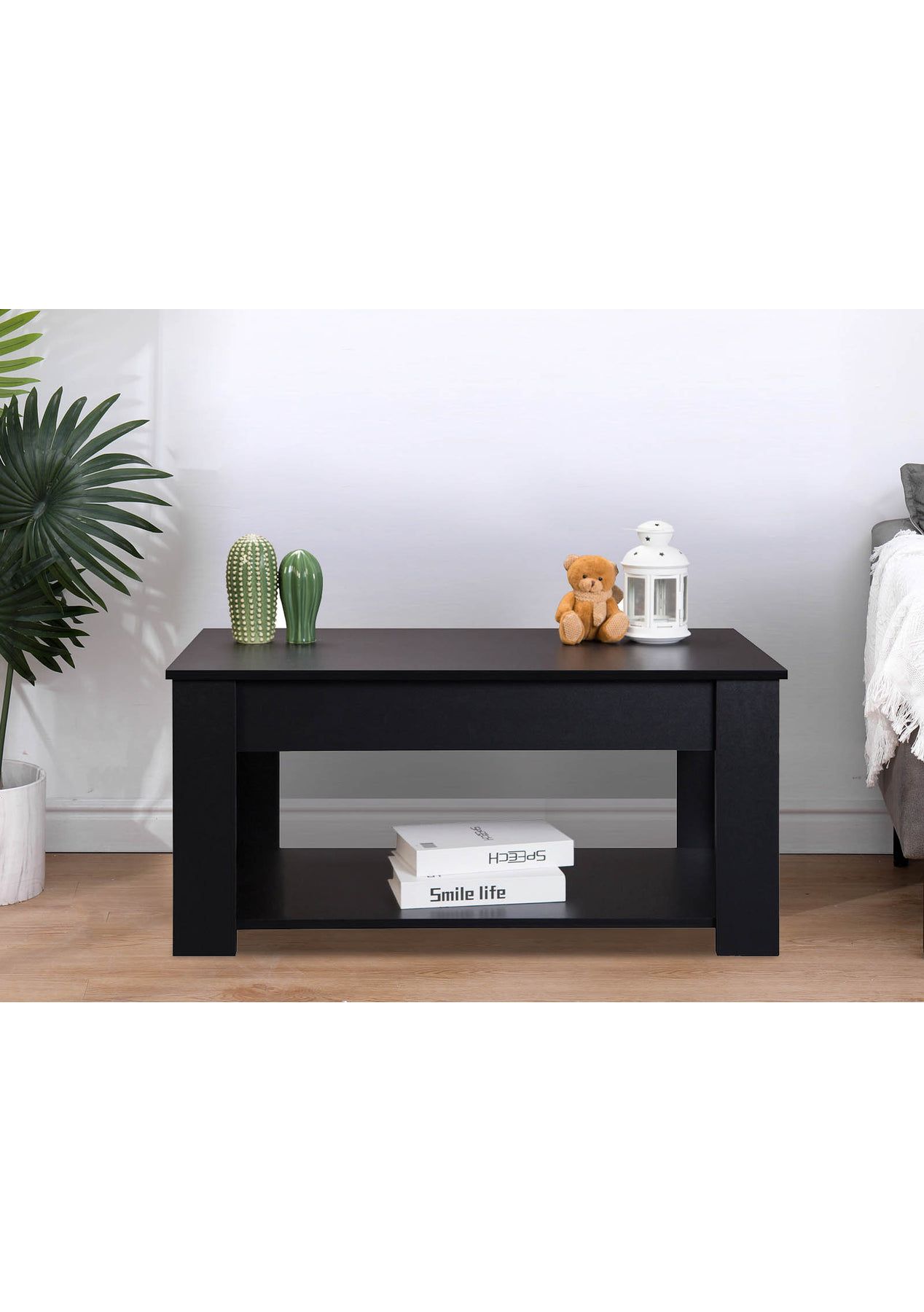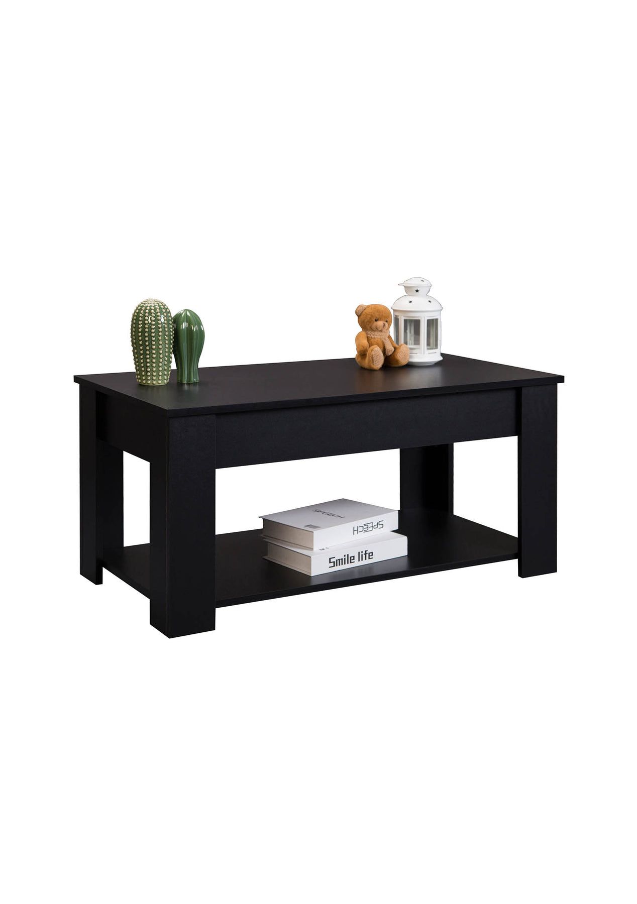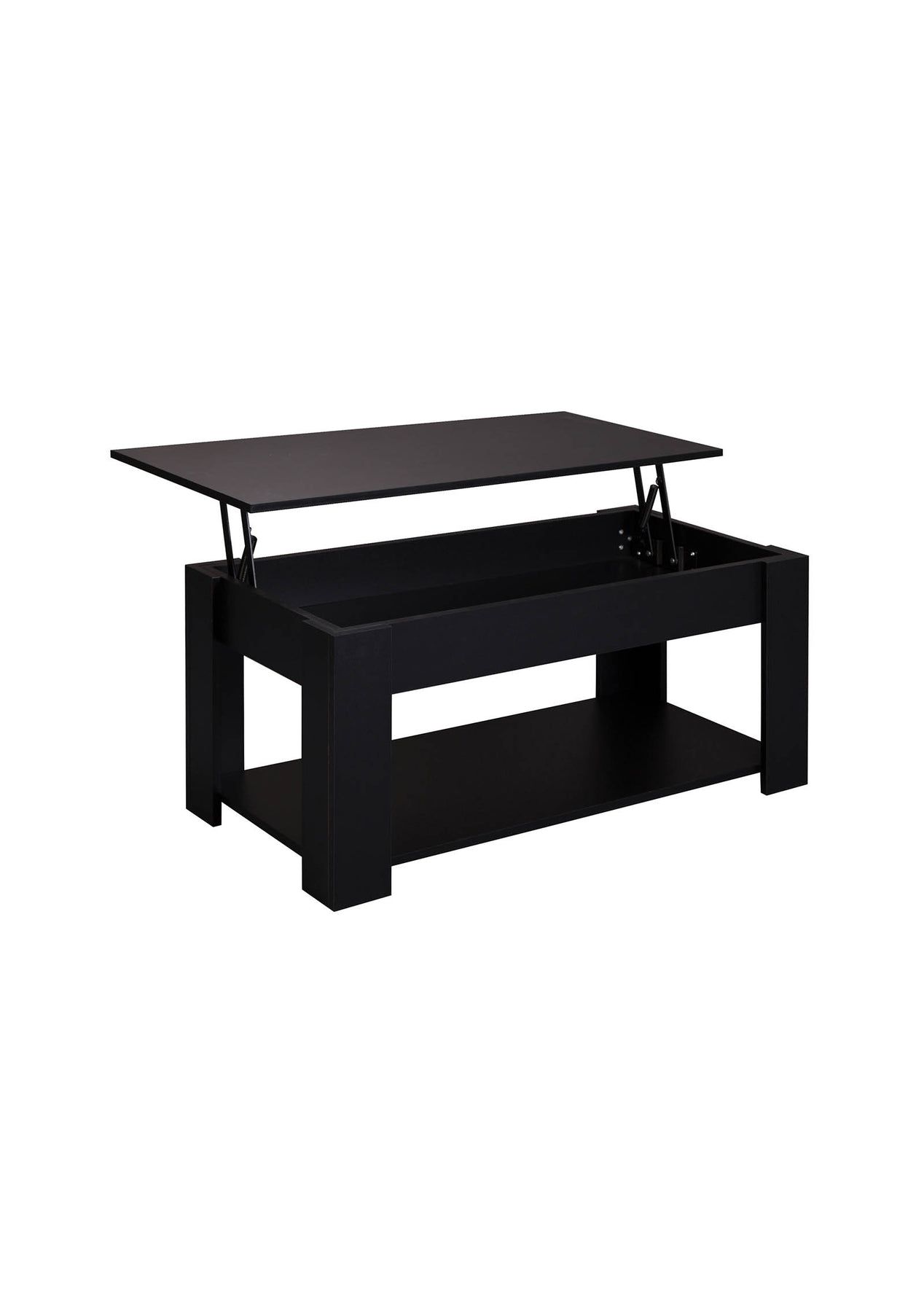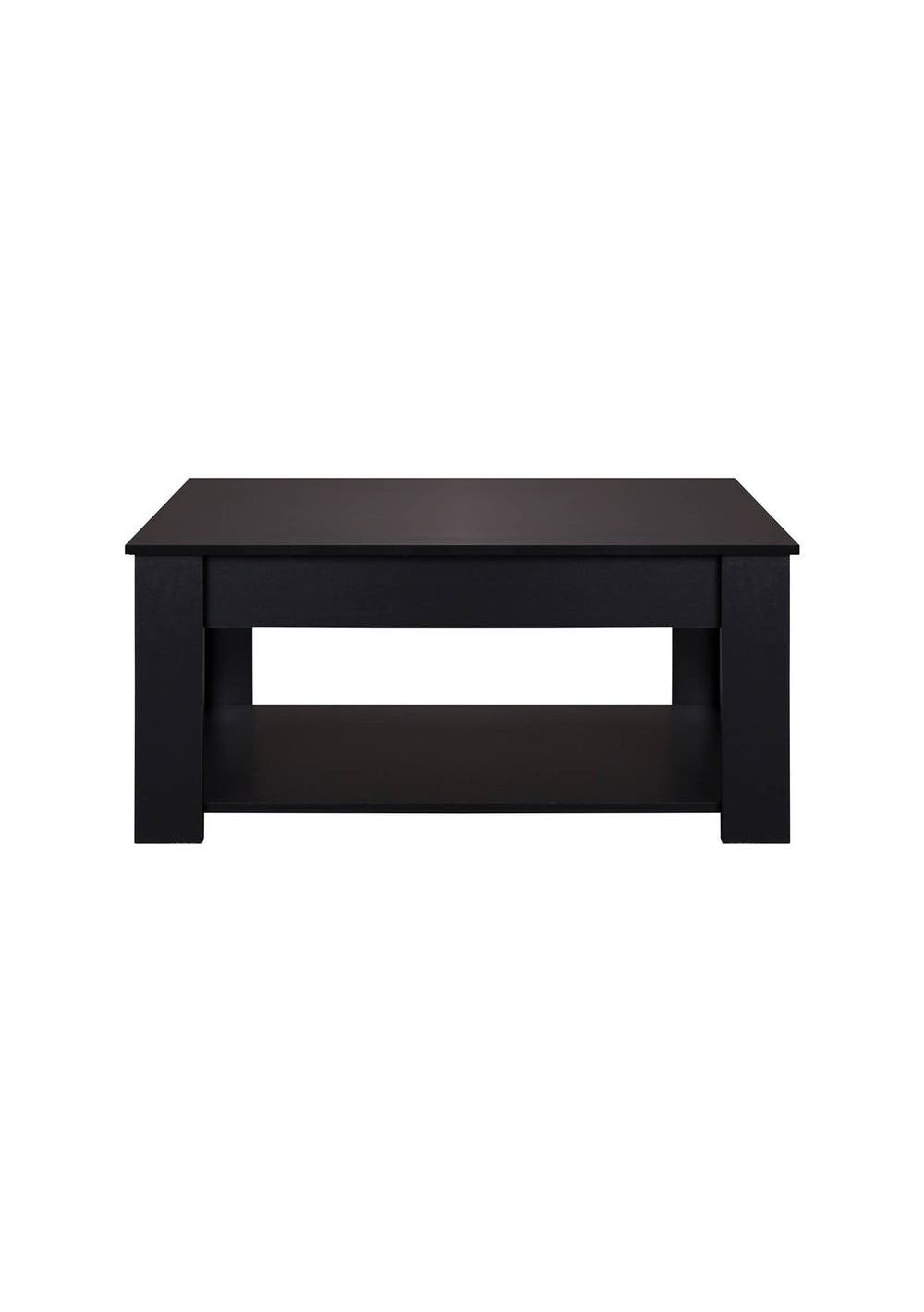 Lyftbar Coffee Table - Black Add function and style to your living space with the Lyftbar Lift-Top Coffee Table in sleek black. This modern coffee table features a hidden storage compartment beneath a lift-up top, ideal for storing remote controls, chargers, and other essentials. A lower shelf provides extra space for books and decorative items. Built from sturdy particleboard and metal fixings, it’s designed to last. With its clean lines and smooth lift-top, it’s ideal for any modern lounge or compact space. Features:Lift-up top design with hidden storage Sturdy black particle board construction Stable frame with solid legs Open bottom shelf for extra storage Space-saving and easy to organize Smooth lift with metal slider bar Steel fixings for long-lasting durability Specifications:Color: BlackMaterial: ParticleboardProduct Dimensions: 95 cm (L) x 50 cm (W) x 45.5 cm (H)Lift-up Tabletop Weight Capacity: 15 kgHidden Storage Weight Capacity: 10 kgShelf Weight Capacity: 5 kgAssembly: Required Package Contents:1 x Lyftbar Coffee Table Black (flat-packed in box)1 x Assembly Instruction ManualAll required screws and fittings included