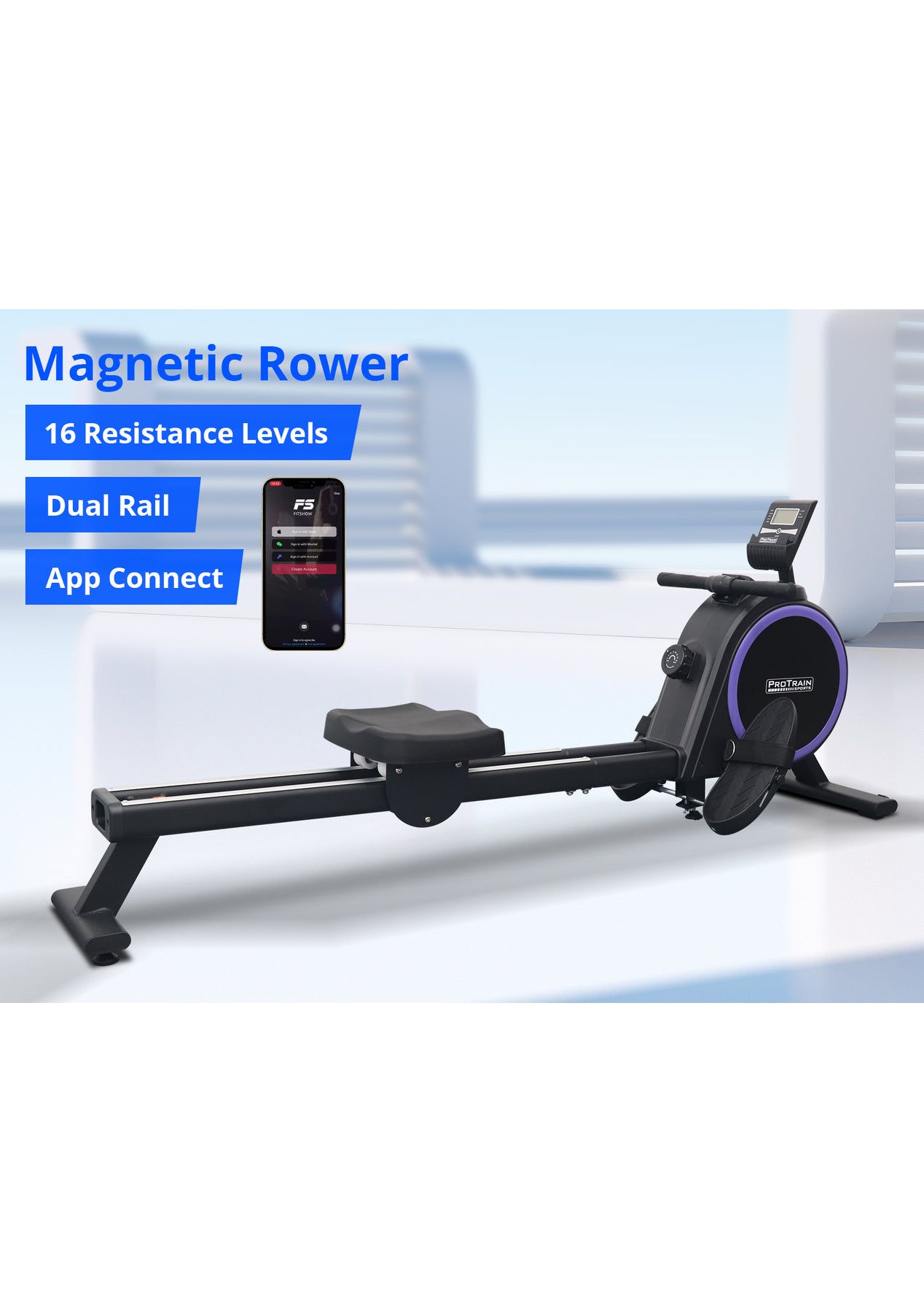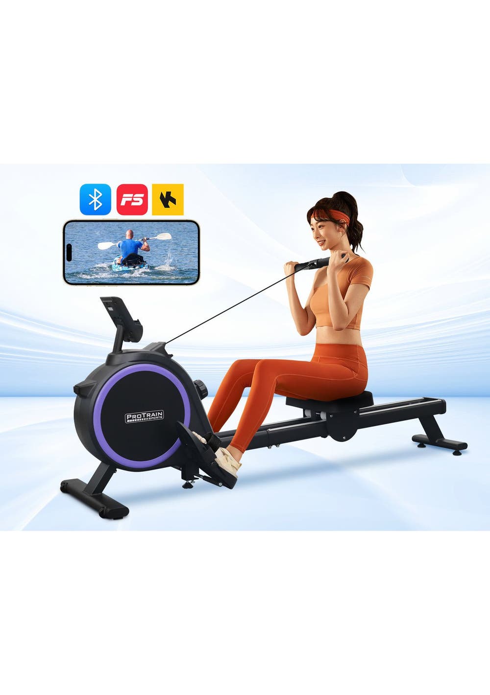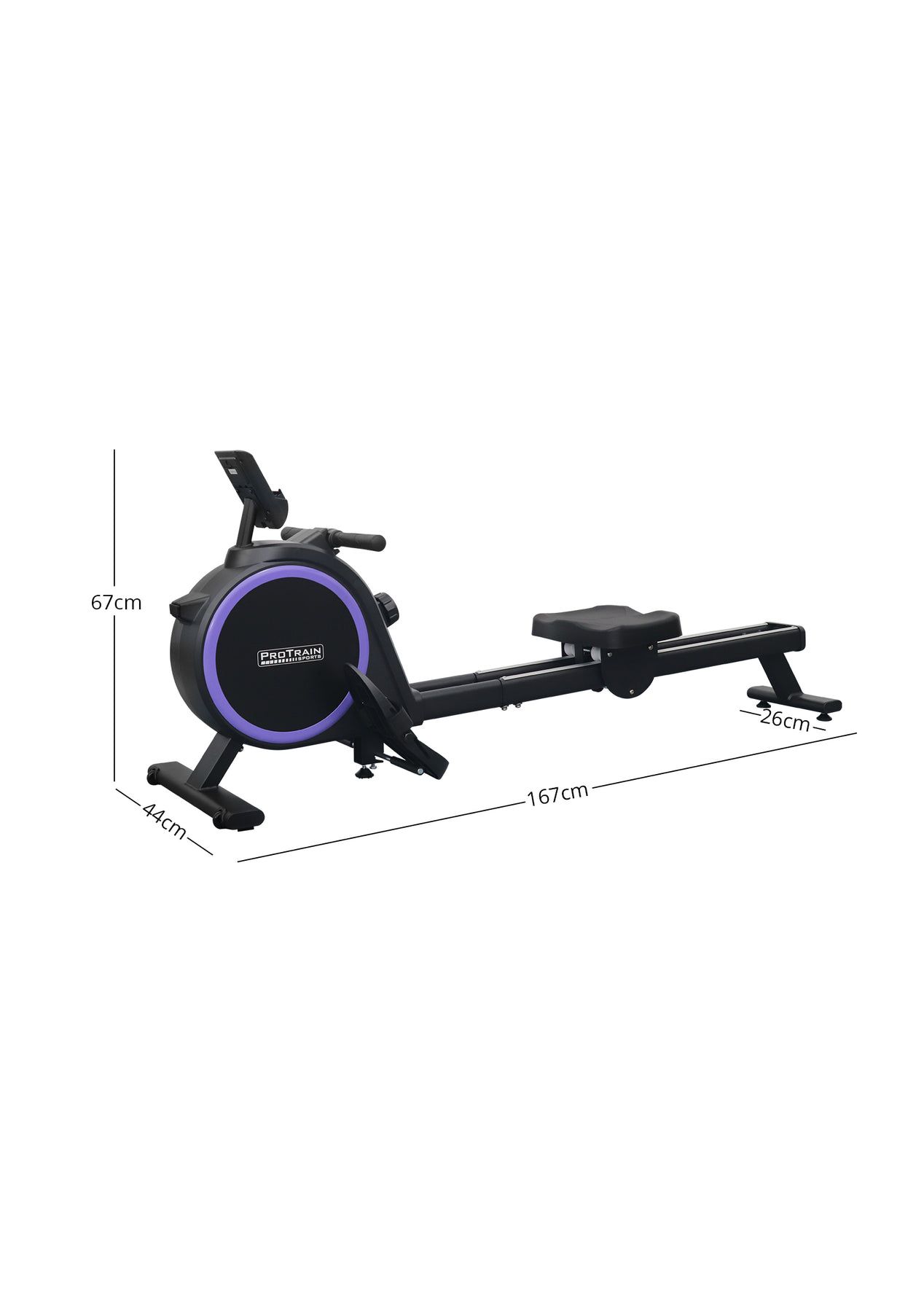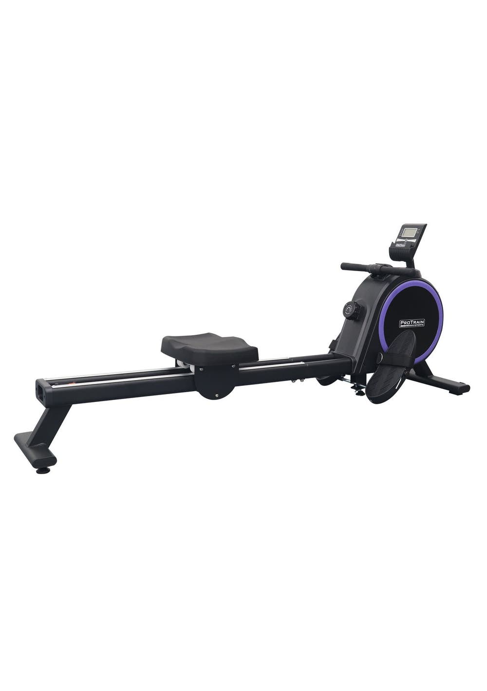 PR71973 - Rowing Machine Elastic Resistance RowerSimple but satisfying. Our Protrain Rowing Machine, utilizing a magnetic brake system, targets all the major muscle groups for well-toned abs.16 resistance levels allow you to work out to the best of your capabilities. The heavy-duty 3kg flywheel works systematically to target several muscle groups, thereby improving cardiovascular health, and monitor the progress on the large LCD display console. You can also track your fitness journey with our Bluetooth application for ease of use.This fitness machine is just perfect for home fitness routines with its quiet operation and super sturdy frame.Features:Magnetic brake systemQuiet operationBluetooth APP to track fitness data16 resistance levelsHeavy duty 3kg flywheelLCD screen to track your workoutWide handlebarDual aluminium glide railsComfortable padded seatAdjustable large footrest for maximum comfortComes with rollers for easy transportSpecifications:Brake system: MagneticFlywheel weight: 3kgResistance level: 16Monitor: RUN, SCAN, CNT, TIME, TOT, CAL, MODEGuide rail: AluminiumAssembled Size: 167x44x67cmWeight capacity: 120kgAssembly required: YesPackage Content:Rowing Machinex1User Manual x1