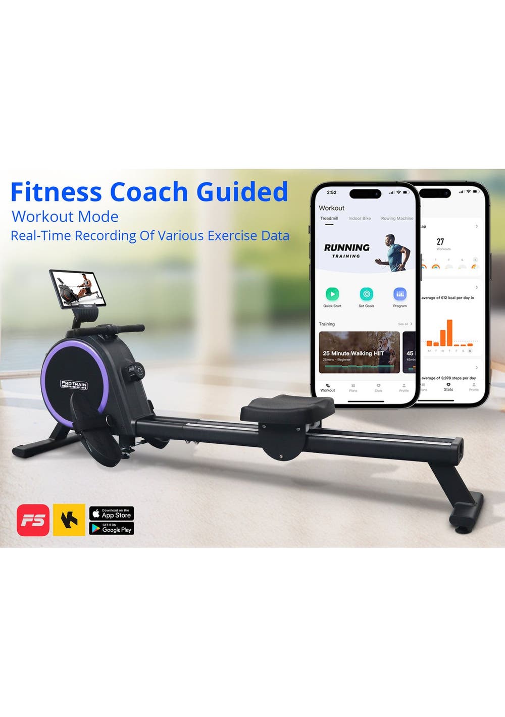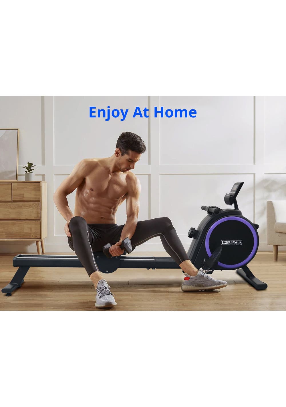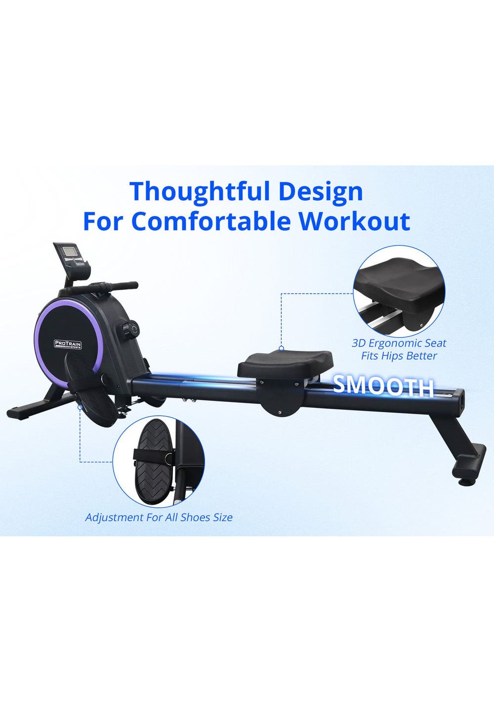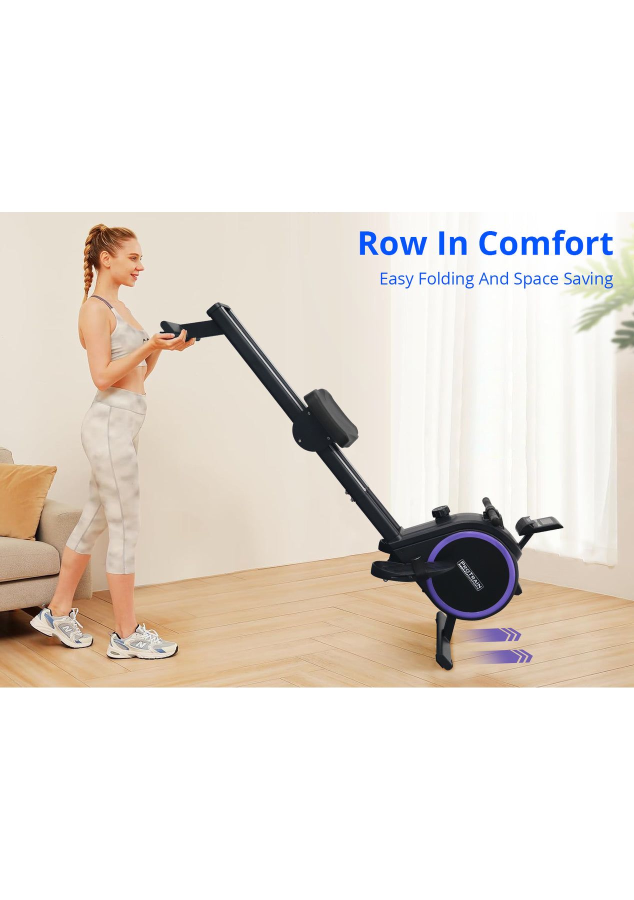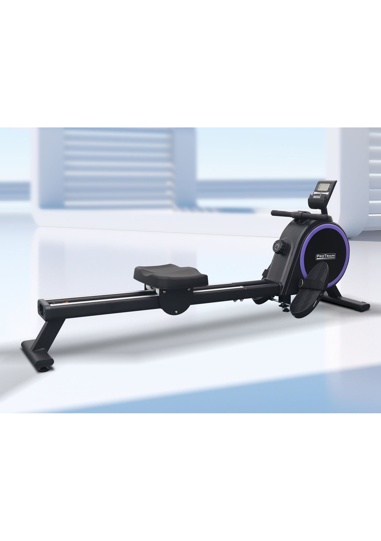 PR71973 - Rowing Machine Elastic Resistance RowerSimple but satisfying. Our Protrain Rowing Machine, utilizing a magnetic brake system, targets all the major muscle groups for well-toned abs.16 resistance levels allow you to work out to the best of your capabilities. The heavy-duty 3kg flywheel works systematically to target several muscle groups, thereby improving cardiovascular health, and monitor the progress on the large LCD display console. You can also track your fitness journey with our Bluetooth application for ease of use.This fitness machine is just perfect for home fitness routines with its quiet operation and super sturdy frame.Features:Magnetic brake systemQuiet operationBluetooth APP to track fitness data16 resistance levelsHeavy duty 3kg flywheelLCD screen to track your workoutWide handlebarDual aluminium glide railsComfortable padded seatAdjustable large footrest for maximum comfortComes with rollers for easy transportSpecifications:Brake system: MagneticFlywheel weight: 3kgResistance level: 16Monitor: RUN, SCAN, CNT, TIME, TOT, CAL, MODEGuide rail: AluminiumAssembled Size: 167x44x67cmWeight capacity: 120kgAssembly required: YesPackage Content:Rowing Machinex1User Manual x1