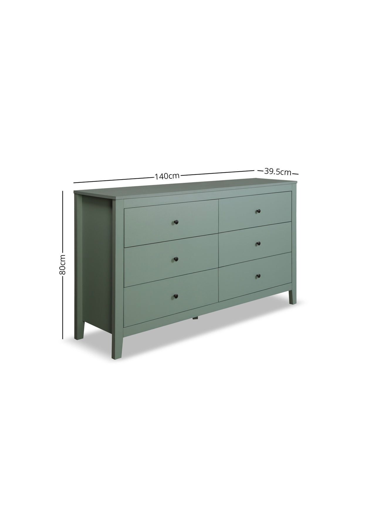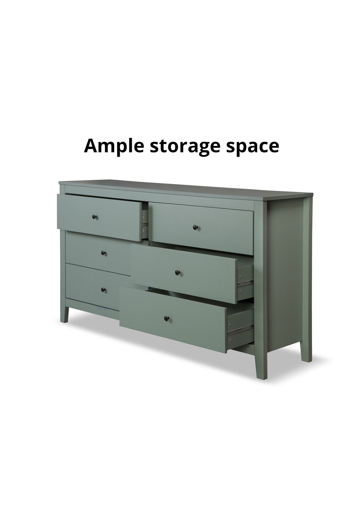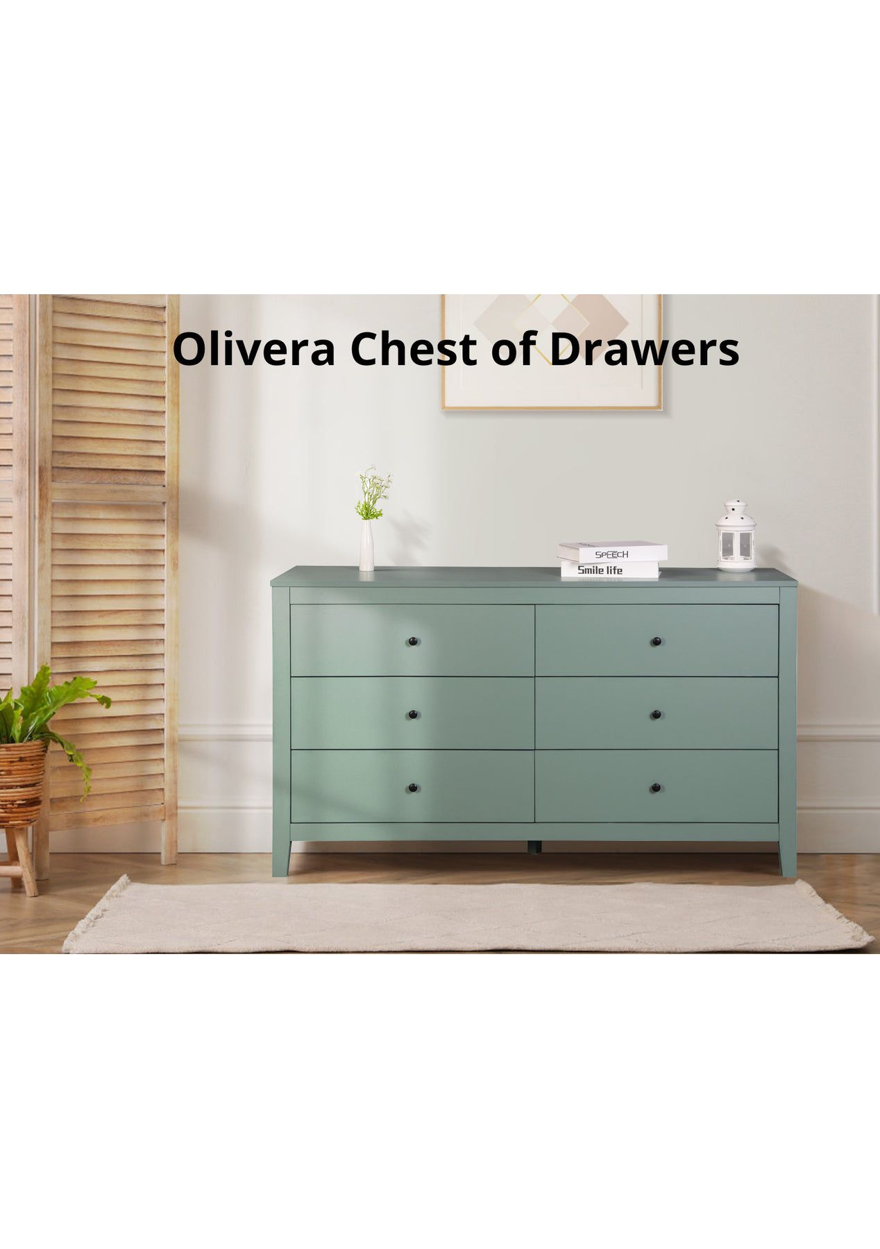 Olivera 6-Drawer Lowboy Simple, functional, and stylish—the Olivera Collection is a smart addition to any home. The Olivera 6-Drawer Lowboy is a practical and stylish solution. With a clean, modern design, it’s made from quality particleboard and finished in smooth paper laminate to suit any home décor. It features six roomy drawers—perfect for clothing, accessories, or everyday essentials. Each drawer slides smoothly on easy-glide runners for added convenience. Made from durable particleboard with a smooth paper finish, it’s built to last. With clean lines and a modern green tone, the Olivera adds a fresh, minimalist touch to your space. Features:Stylish modern design with a fresh green finishSix spacious drawers for convenient storageSturdy particleboard construction with smooth paper surfacePowder-coated metal runners ensure smooth drawer operationEasy to clean and quick to assemble Specifications:Color: GreenMaterial: Particleboard and Wood, Paper FinishProduct Dimensions: 140 cm (L) × 39.5 cm (W) × 80 cm (H)Assembly: Required Package Contents:1 x Olivera 6-Drawer Lowboy (flat-packed in 2 boxes)1 x Assembly instruction manualAll required screws and fittings included Aka: Drawers / Storage / Cabinet / Chests of Drawers