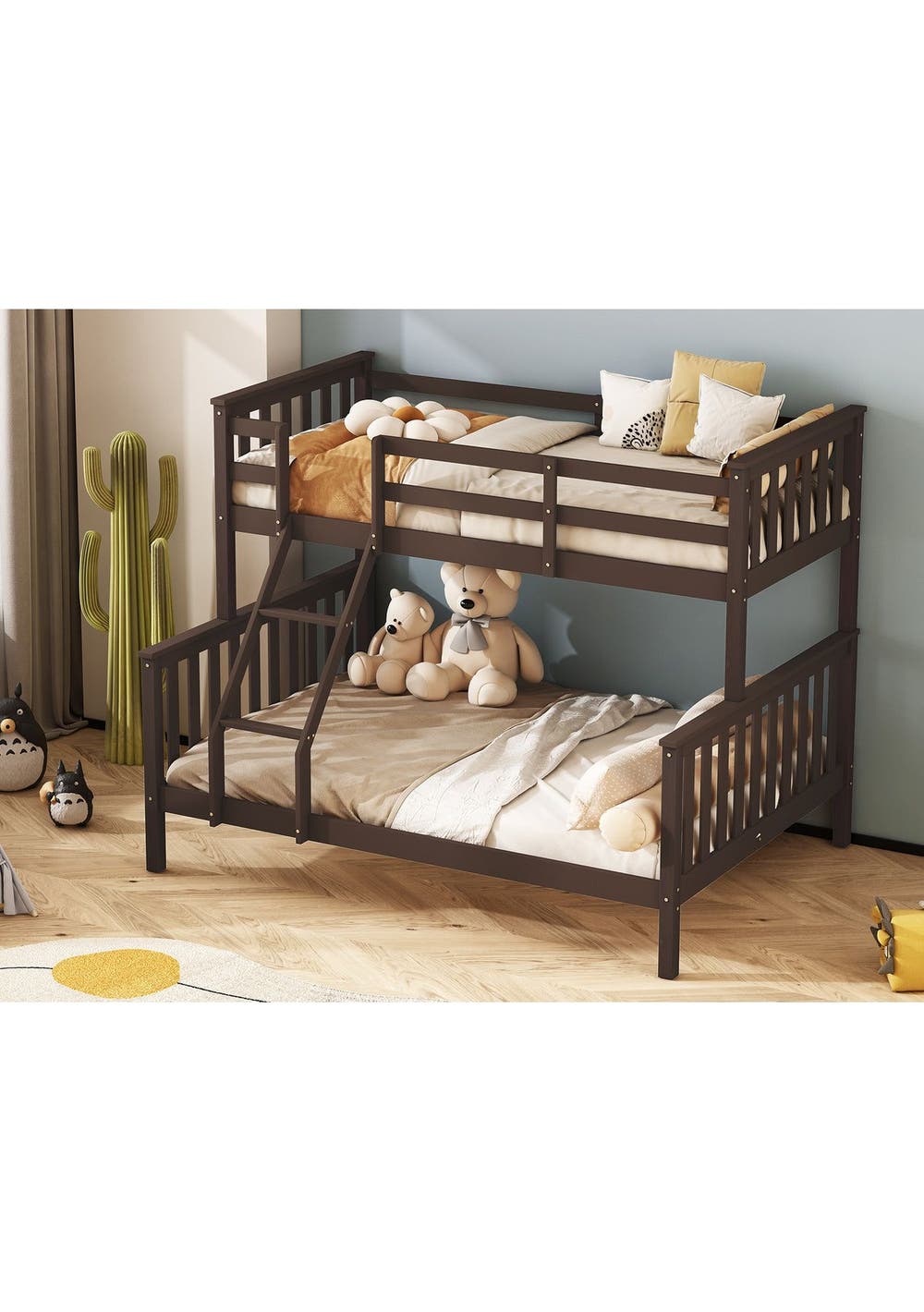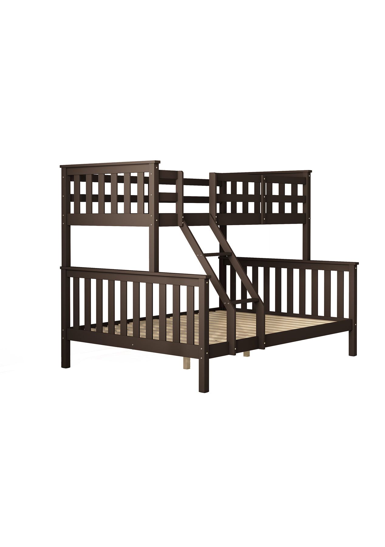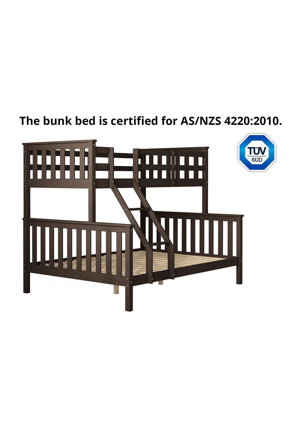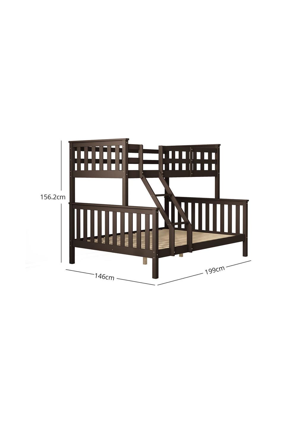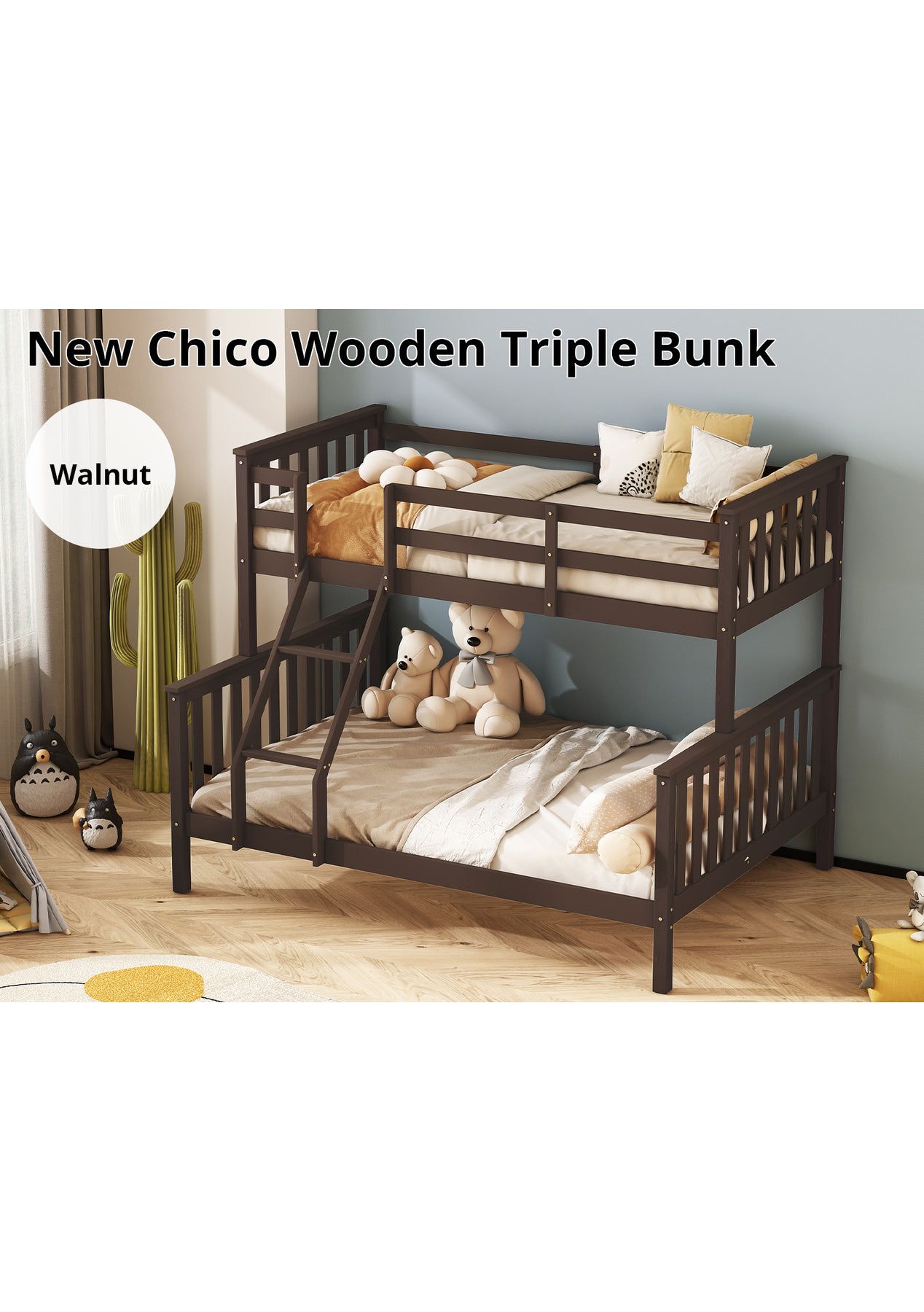 New Chico Triple Bunk Bed - Walnut The Chico Bunk Bed is the perfect solution for growing families. With a Single bed on top and a Double bed on the bottom, this space-saving triple bunk bed is ideal for kids of all ages. It offers your children the fun of a bunk bed while providing extra space for friends or family visits without occupying additional space. Crafted from solid pine plywood in a modern design, this durable bunk bed blends seamlessly with any room decor and is built to last. Sturdy, functional, and stylish, the Chico Bunk Bed is perfect for homes with limited space. Features:Clever design that maximizes space and provides a functional sleeping solutionA ladder for easy access, which can be positioned on either the left or the right2 cm-thick safety fences provide extra security on the top bunk5 cm-thick legs ensure strong and stable bed supportSolid pine plywood construction for durability and strengthCertification: Meets AS/NZS 4220:2010 standards Specifications:Color: WalnutSize: Single and DoubleMaterial: Solid Pine Plywood Product Dimensions: 199 cm (L) x 146 cm (W) x 156.2 cm (H)Top Bunk Fits Standard NZ Single Mattress: 190 cm (L) x 90 cm (W)Bottom Bunk Fits Standard NZ Double Mattress: 190 cm (L) x 137 cm (W)Top Bunk Weight Capacity: 65 kg (including mattress, evenly distributed)Bottom Bunk Weight Capacity: 150 kg (including mattress, evenly distributed)Assembly: Required Package Contents:1 x New Chico Triple Bunk Bed Walnut (flat-packed in 3 boxes)1 x Assembly instruction manualAll required screws and fittings included Safety Advice:Do not use mattresses thicker than 20 cm on the top bunk, including bed covers.Top bunks and elevated beds can be hazardous. Not recommended for children under the age of 9.