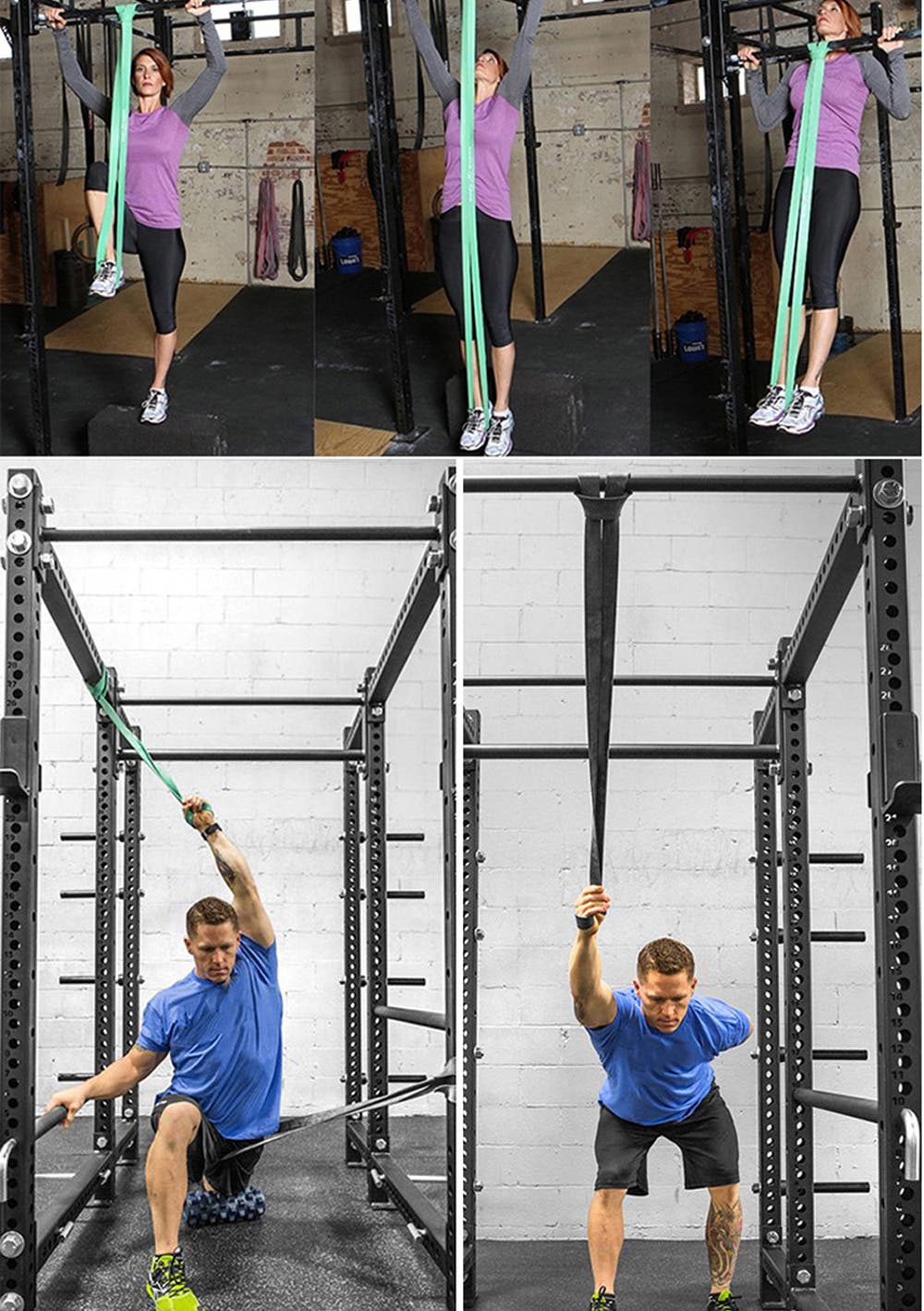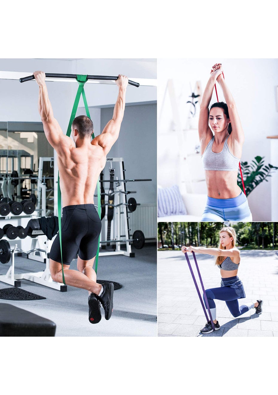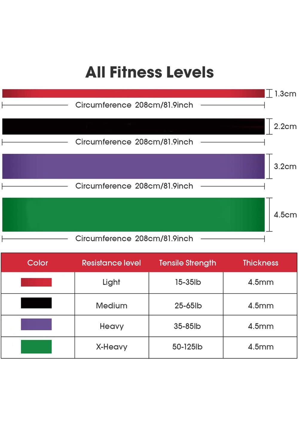 4 pcs Workout Pull up Assist Band Exercise Resistance Bands Material: TPE Product dimensions (LWH): 208 cm Package dimensions (LWH): 25 x 12 x 4 cm Weight: 900 g Features  The pull up bands provide variety to your workouts.  There are many exercise possibilities with a fitness band, which allows for muscles to work concentrically and eccentrically, like pushups, squats, etc.  Don't hesitate to boost your confidence  As professional resistance pulls up bands for men and women, the rubber bands work great on their own, they can also be combined with other equipment’s to do powerlifting, pull ups and other exercises  Made of 100% natural latex, our pull up assist bands are durable, soft and ecofriendly.  Moreover, these lightweight bands who can be stashed in a carrying bag are the perfect companion to those wanting to exercise anywhere  Red (15-35LB), Black (25-65LB), Purple (35-85LB), Green (50-125LB)  Package Include  4 x Workout Pull up Assist Band  1 x Carrying bag 