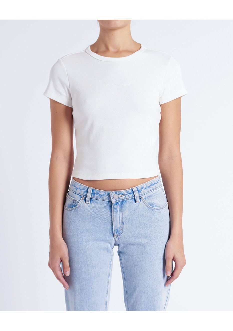 Fabrication: 100% Cotton 90's Rib Baby Tee is a short sleeved t-shirt with a fitted silhouette and thick 2x2 rib cotton fabric. Featuring Abrand Jeans tonal embroidery on the centre front. The perfect denim complement with any of your favourite Abrand jeans, the 90's Rib Baby Tee is super flattering and versatile and can be worn alone or pared back with any jacket or blazer.