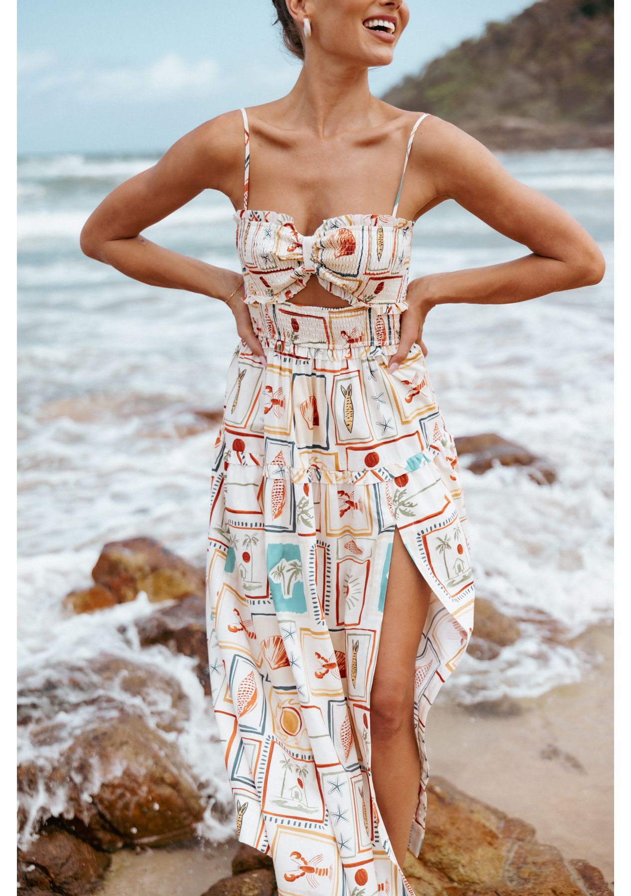 Founded in Australia in 2014, Petal & Pup has quickly become the go-to destination for effortless and forward-trending style. Loved for their take on modern femininity, they offer elevated but attainable pieces for all of life's moments - big and small. PRODUCT DETAILS Featuring a stunning Sardinian-inspired print, this maxi dress blends style and elegance with ease. The sweetheart neckline with delicate frill details and thin adjustable straps offer a breezy, feminine touch, while the elasticised shirred bodice ensures a comfortable, flattering fit. - Maxi length - Sweetheart neckline - Thin adjustable straps - Cut under bust - Frill detail on neckline - Elasticised shirred bodice - Front split detail - A-line skirt design - Sardinia inspired print - Partially lined - 100% Cotton - Material - 100% Cotton SIZING - Model is 170cm and wears a size XS - Model stats: Bust - 86cm, Waist - 61cm, Hips - 89cm GARMENT CARE - Cold hand wash separately