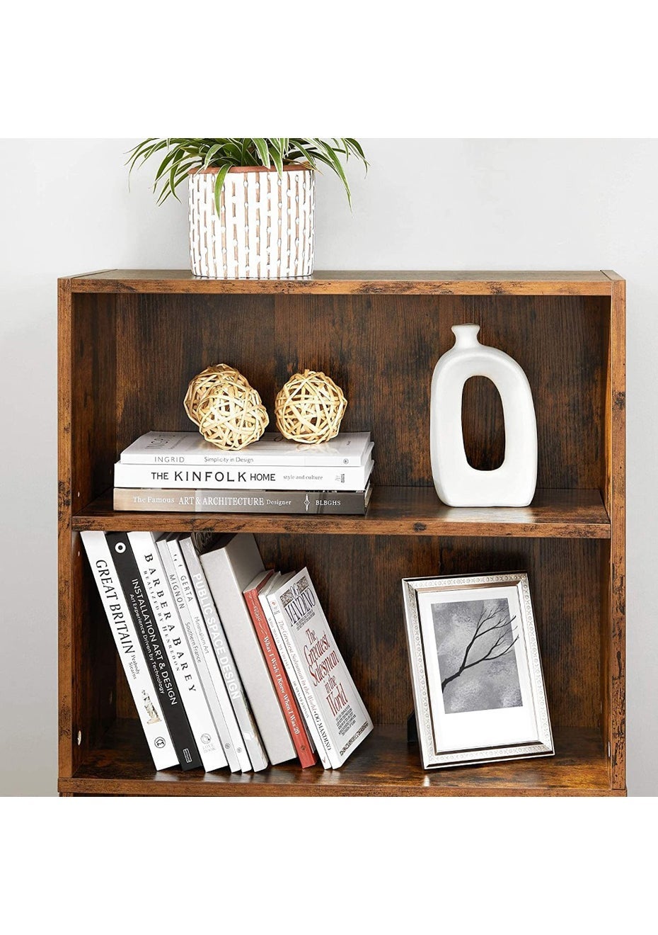 2. The first and third shelves feature three adjustable height levels to flexibly accommodate tall books, photo frames, or storage baskets.
