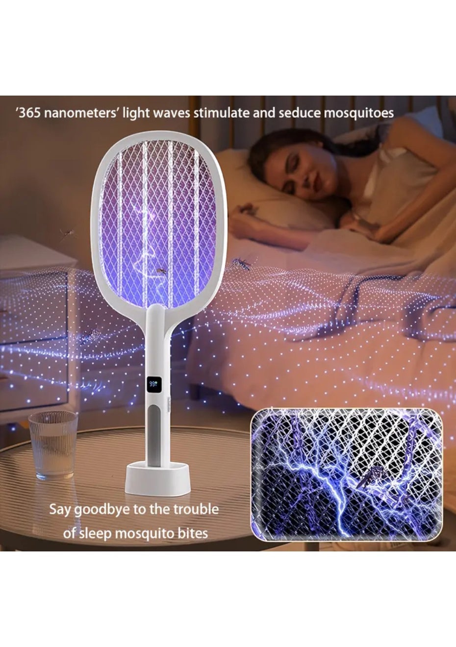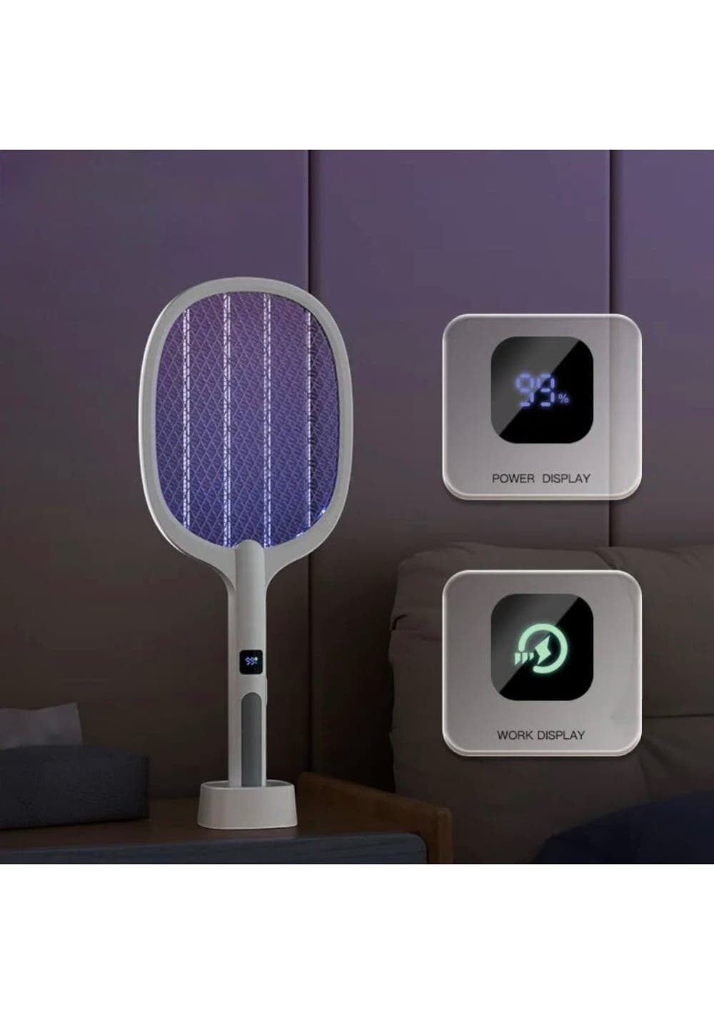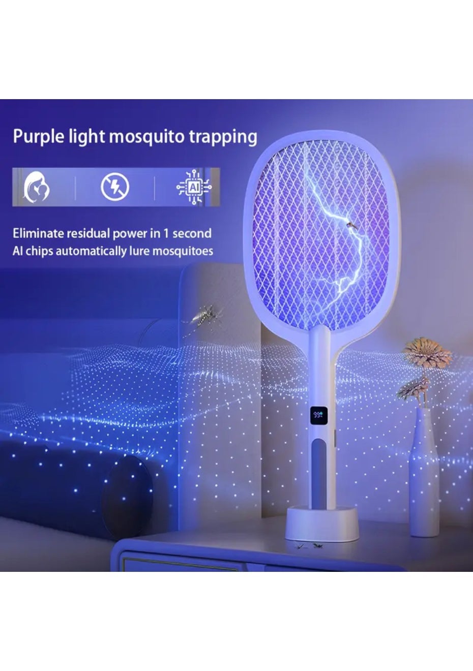 Electric Mosquito Swatter Rechargeable Handheld Bug Zapper Purple Light USB Charging Base Display Material: ABS Plastic Product Dimensions: 54 × 21.8 × 9.5 cm Package Dimensions: 24.5 × 5 × 53.5 cm Weight: 0.7 kg Key Features Powerful High-Voltage Grid: Effectively zaps mosquitoes and flying bugs with a single swing Dual Mode Operation: Manual and purple light auto mode for flexible day and night use Rechargeable Design: USB charging base with automatic docking for easy and safe charging Smart Display Screen: Shows real-time power level and working mode clearly Safe 4-Layer Mesh: Prevents accidental contact and ensures secure use for adults Brief Summary Description This electric mosquito swatter features a rechargeable design with an intelligent display and automatic charging base. Use it manually or switch to purple light mode to attract and eliminate bugs effortlessly. Designed for safe indoor use and reliable mosquito control. Package Includes 1 × Electric Mosquito Swatter 1 × Charging Base 1 × USB Cable Not for use by children Keep out of reach of children. Do not allow children to operate or play with the device to avoid electric shock or injury.